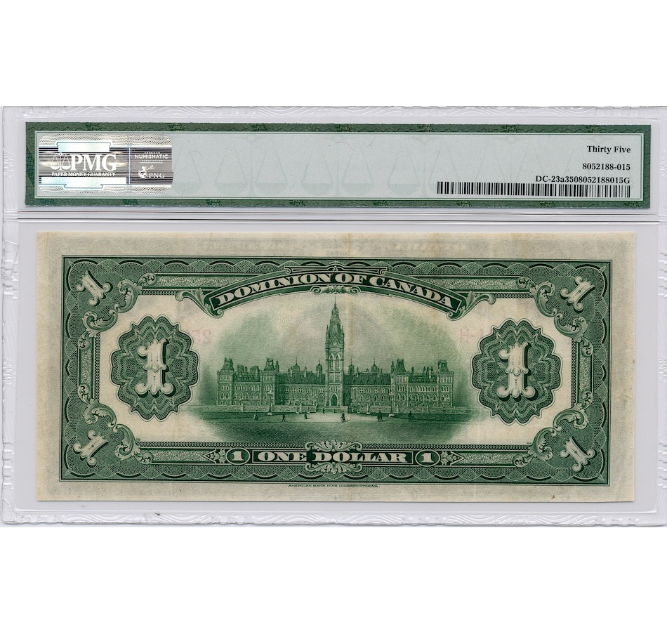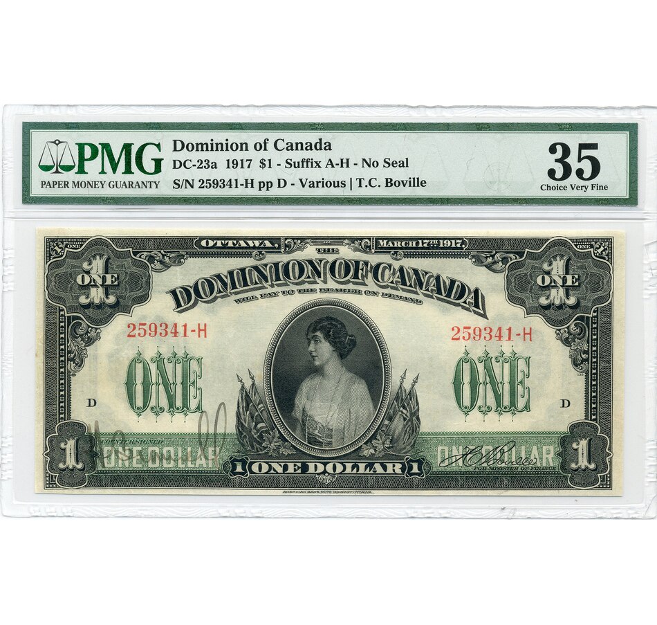 • $1 1917 Dominion of Canada Banknote, PMG Certified as Choice Very Fine 35, Serial Number 259341-H