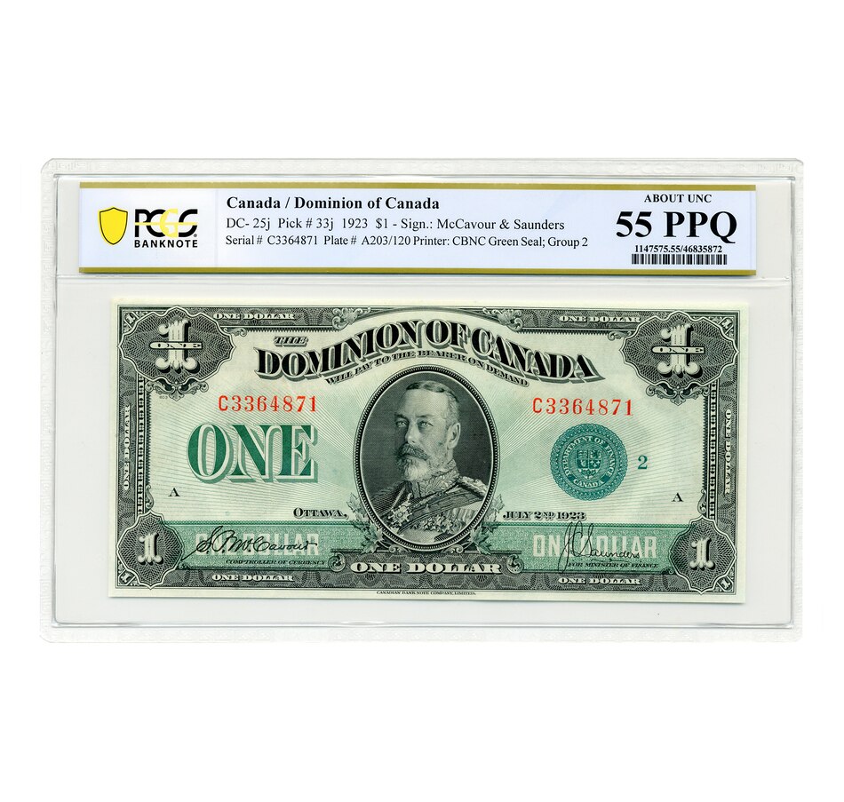 This is a superb and rare about uncirculated example of Canada's last large-format one-dollar banknote issued in 1923. It has been independently third-party certified and graded by the PCGS (Professional Coin Grading Service) as "Choice About Uncirculated 55." PCGS is one of the largest and most widely recognized companies providing independent third-party grading of coins and banknotes.