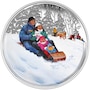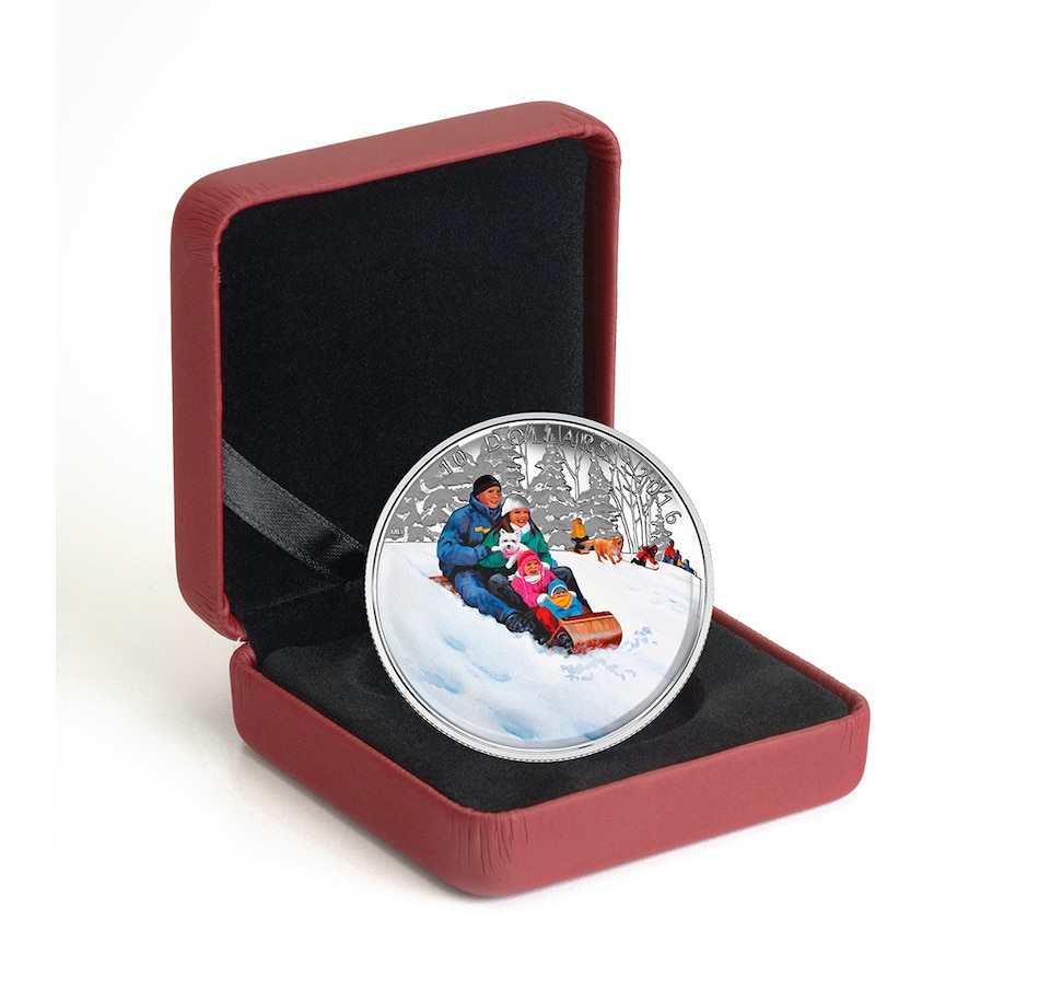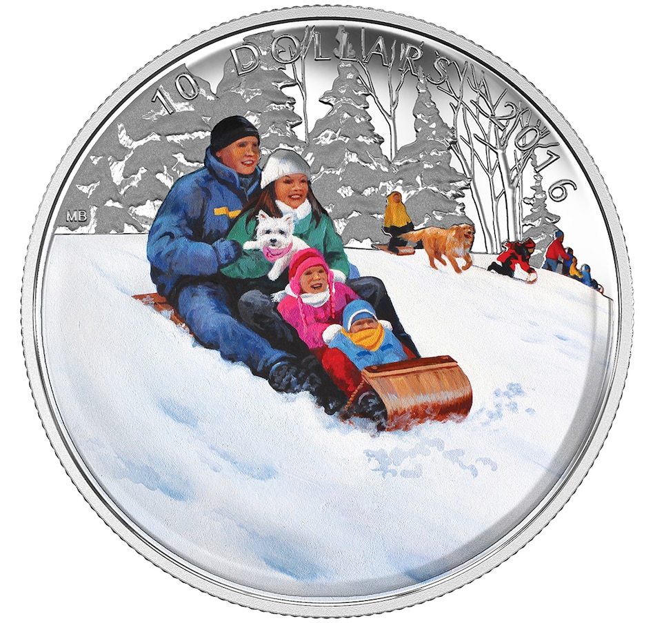 The design by Canadian artist Maurade Baynton captures a family of four dressed in their warmest snow gear. With a scarf draped over his mouth and chin to protect against the cold wind, a young child sits at the front of the wooden toboggan; behind him, his rosy-cheeked sister as they slowly gather momentum. Mother and father sit at the rear holding the family pet. They excitedly look ahead with broad smiles in anxious anticipation. Vibrant colour recreate the pure white freshly fallen snow.