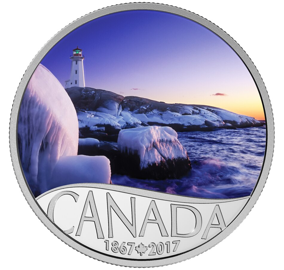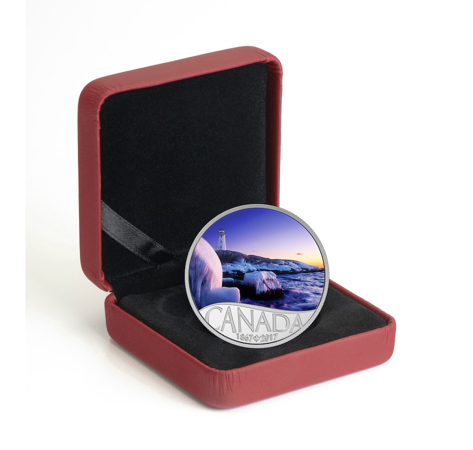 The coin is based on an image by Canadian nature photographer Dale Wilson and features a sea-level view of the rocky shoreline at Peggy's Cove, Nova Scotia. The sun's first rays appear in the horizon to the east, over the calm waters of the Atlantic Ocean; while its return adds a warming glow to the winter sky, the faint daylight illuminates the wave-battered rocks that line this inlet. The iconic Peggy's Cove Lighthouse is seen rising up toward the sky—a familiar landmark since its construction in 1915 (on the site of the previous 1868 light), and arguably is one of the world's most photographed lighthouses. The application of vibrant colour over engraving recreates the life-like qualities of the original photograph, including the golden hues of the sunrise in a setting that is otherwise dominated by dark blue and grey colours.