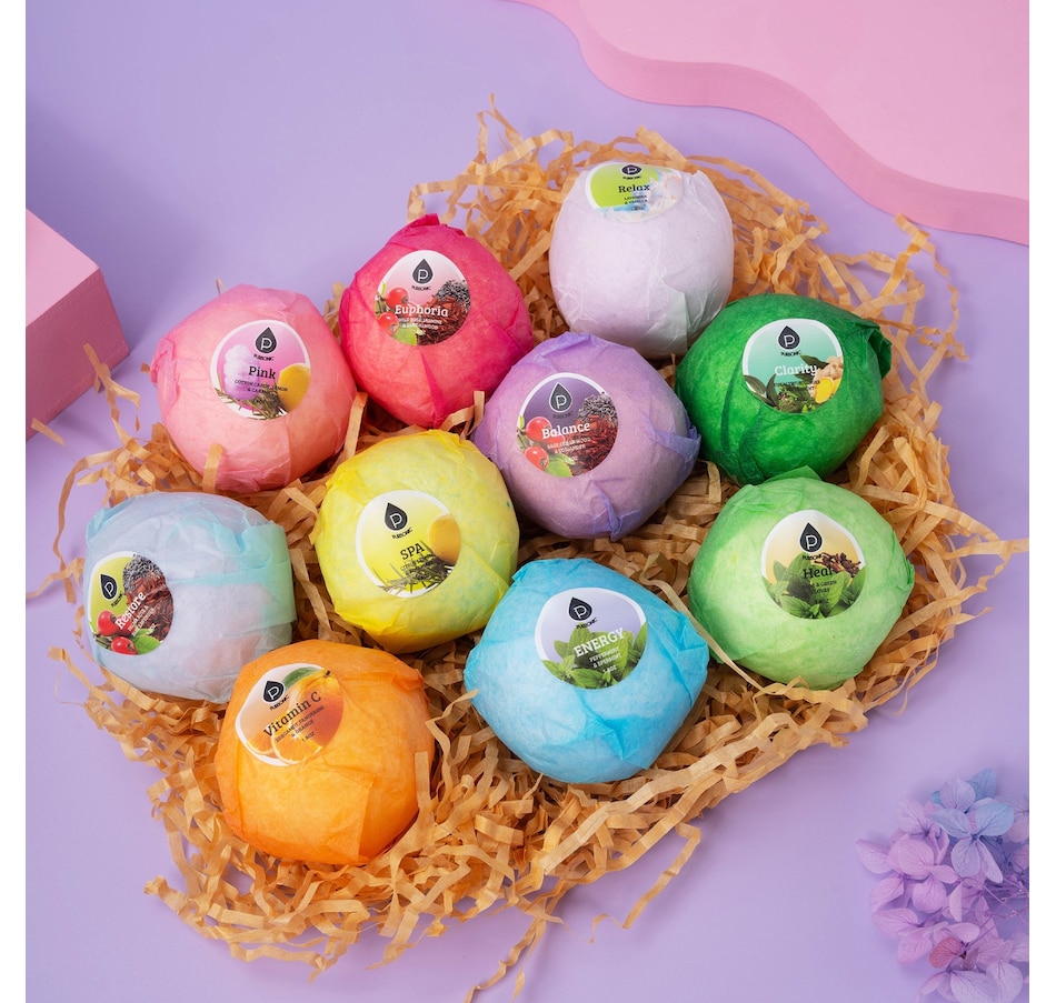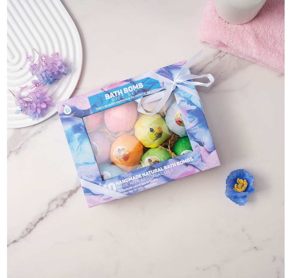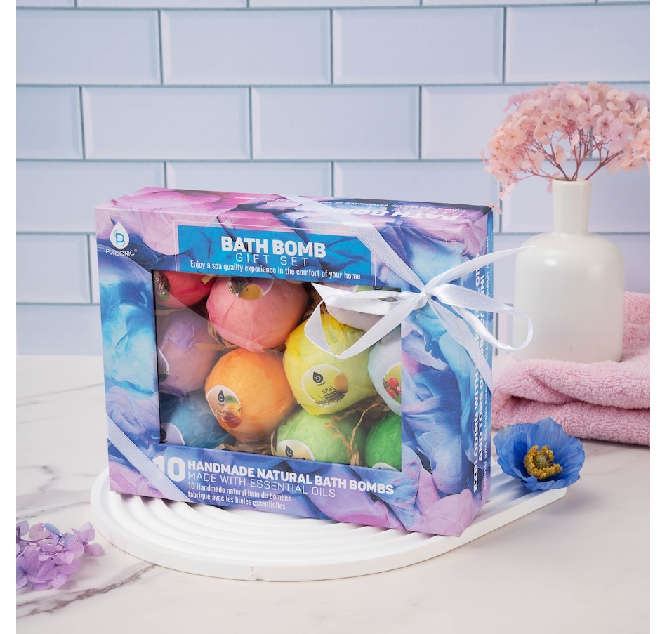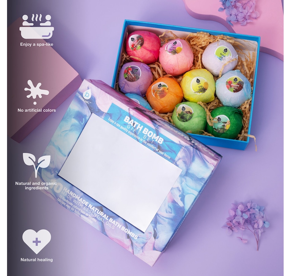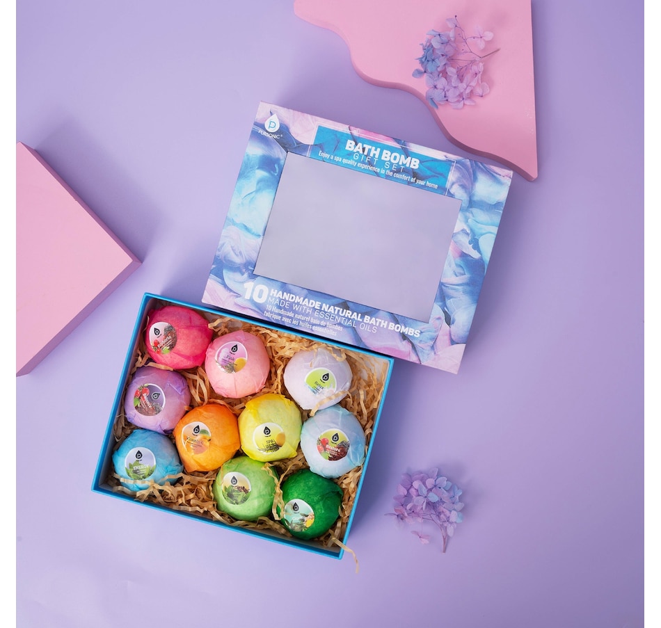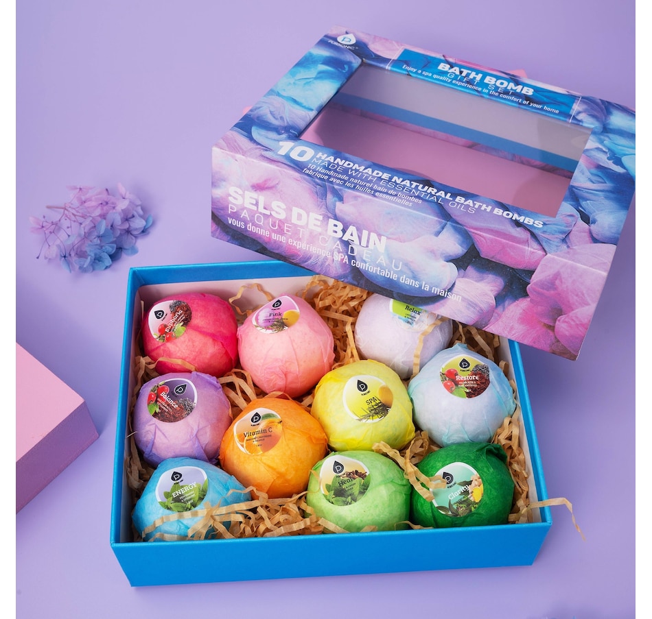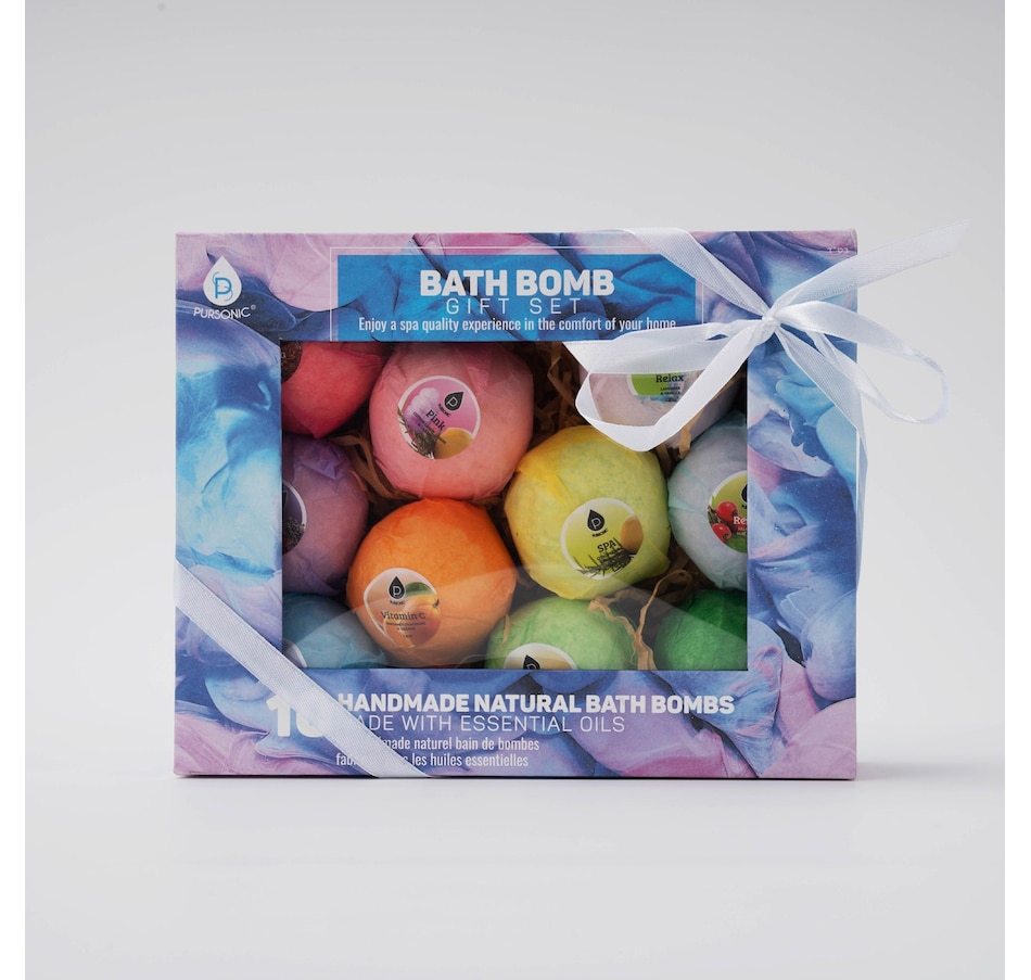 A collection of 10 unique 4.1oz Bath Bombs made with natural and organic ingredients with Essential Oils, Fragrance Oils. No artificial colors; washes away completely!FeaturesSet includes 10 bath bombs: Balance, Pink, Clarity, Relax, Euphoria, Restore, Energy, Spa, Heal & Vitamin CFor spa quality, aromatherapy and muscle reliefBest Gift Set-The moisturizing benefits of the bath bombs are truly explosive. Each bath bomb softens skin from head to toe while immersing you in a soothing scents bath experienceRelaxing bath aromatherapy that's fun and easy to useEach bath bomb is like having a spa treatment right at home. The unique mineral salt formulations can thoroughly clean the skin, making skin more healthy, aromatherapy bath let you experience the fragrance of the charming bathing funModel Number:Â BBGS10