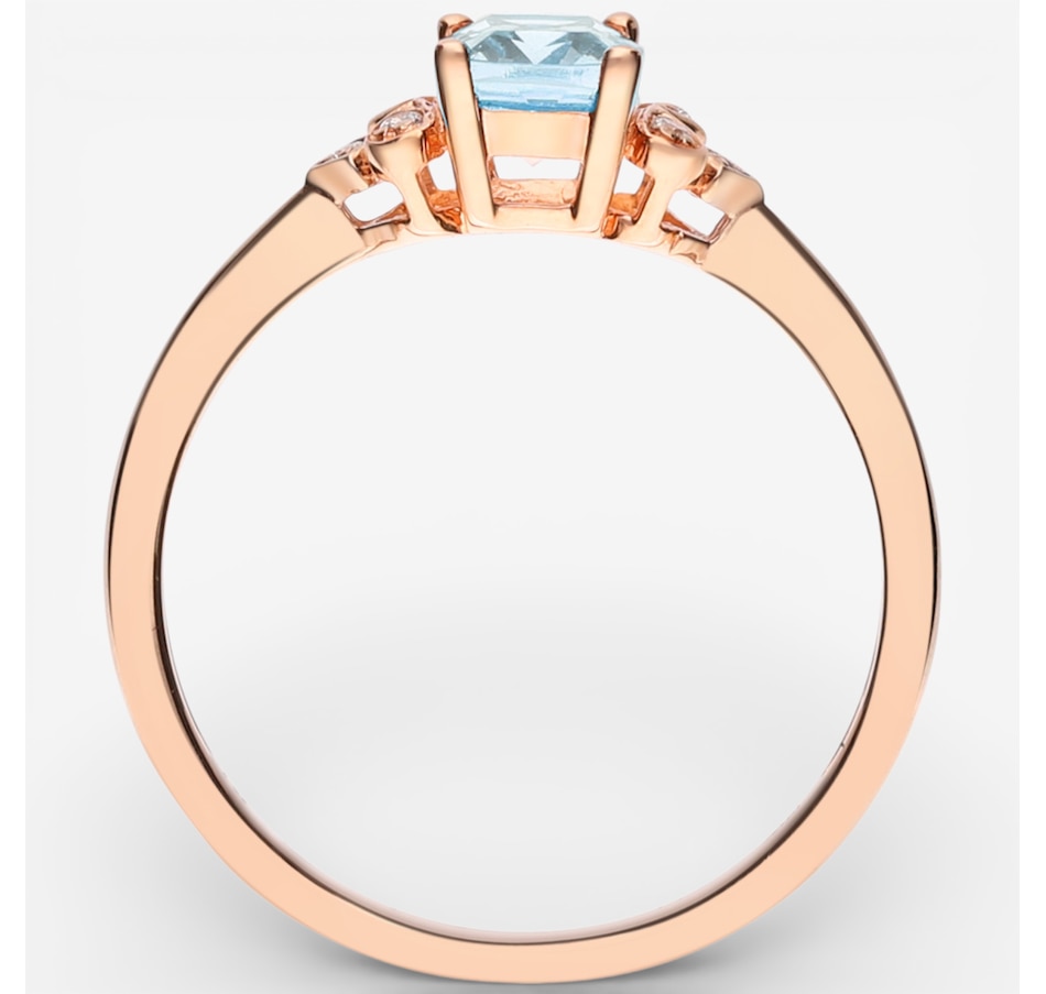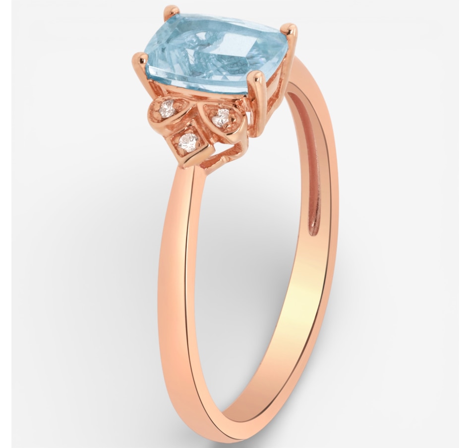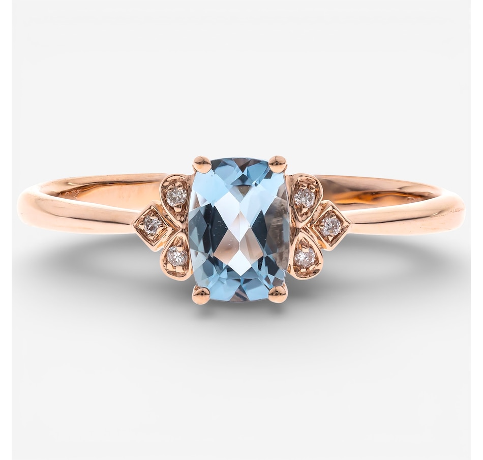 This elegant ring features a softly coloured aquamarine with a checkerboard‑faceted finish that adds extra sparkle and visual interest. The cushion‑cut stone brings a refined, modern feel, complemented by delicate diamond accents that enhance the design without overwhelming it. With its polished profile and comfortable width, this piece is perfect for everyday wear or special occasions.