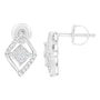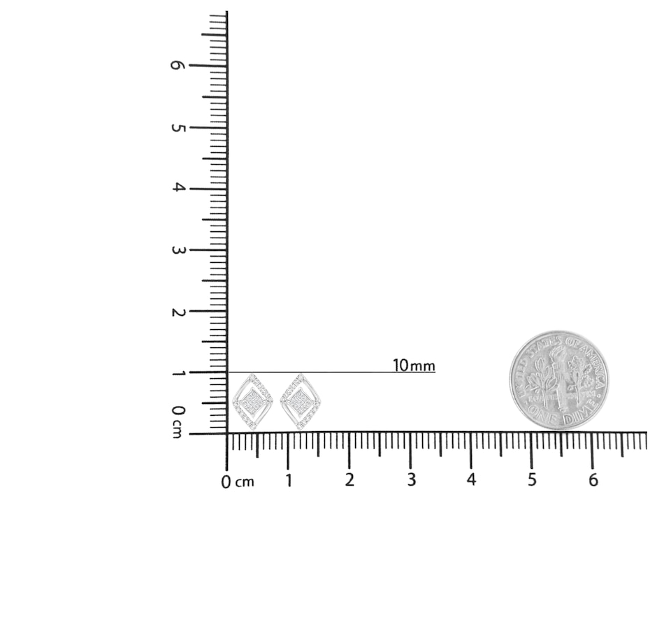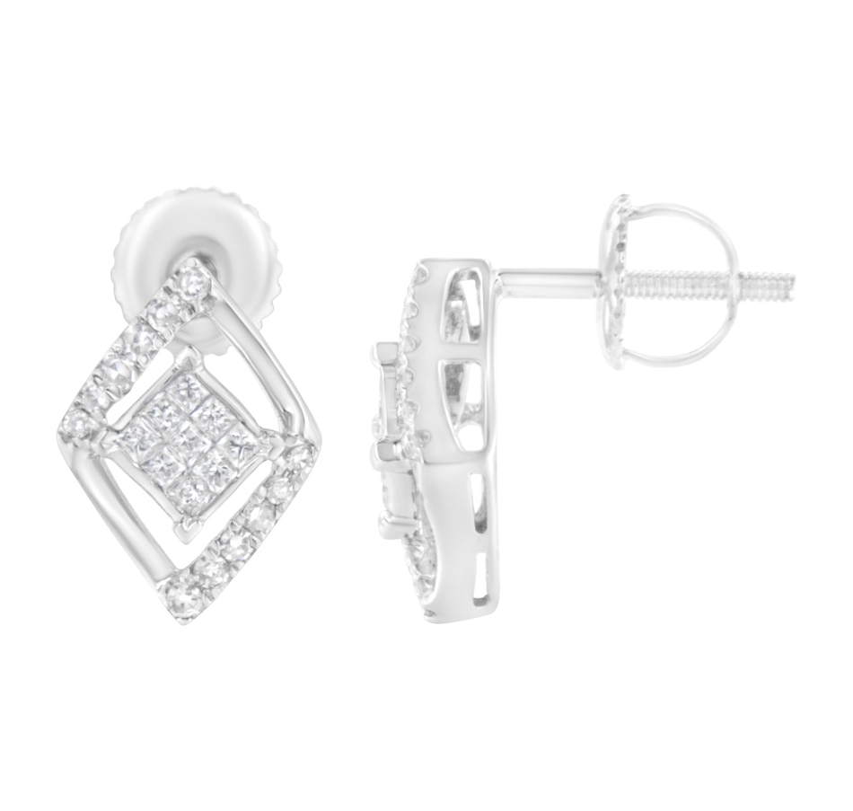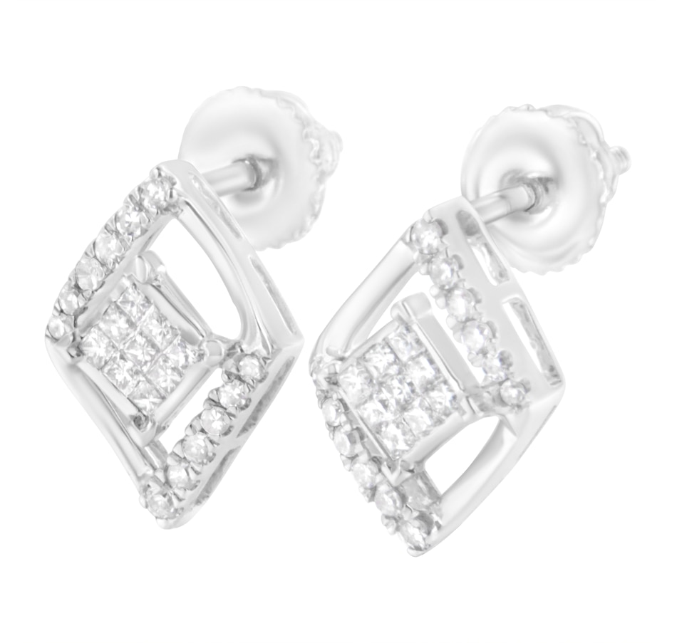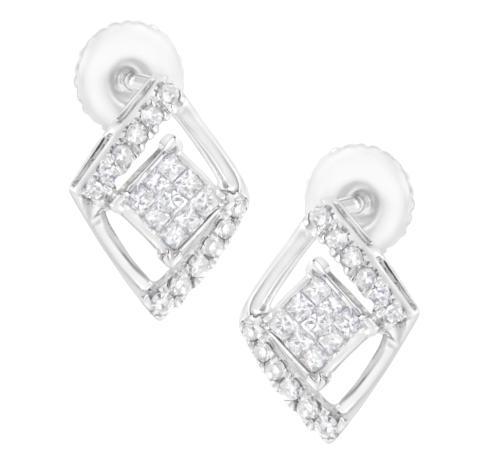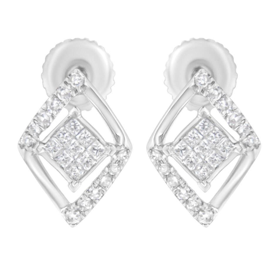 Elegant and timeless, these gorgeous 10 karat white gold stud earrings feature 0.327 carat total weight of diamonds with 42 individual stones. These earrings have a kite set square shape floating inside a diamond shaped frame. The square is made up of an invisible set cluster of 9 square, princess cut diamonds. This composite diamond floats inside a domed diamond shaped frame studded on opposing diagonal sides with round diamonds. The earrings feature secure threaded screwback closures. These classic earrings make a great gift for any special occasion! Diamonds are thought to give the wearer clarity and illuminate solutions to life’s problems, as well as encouraging abundance, strength, courage, harmony, faithfulness, and commitment. These stud style earrings are subtle enough for casual affairs but sparkle in formal settings as well. Coordinate these earrings with your favorite diamond necklace or other diamond jewelry to create a complete elegant ensemble.