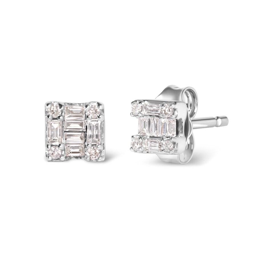 Introducing a mesmerizing masterpiece crafted with exquisite details. Behold these 10K White Gold Stud Earrings, adorned with a dazzling mosaic of round and baguette diamonds. With a total weight of 1/7 cttw and 20 diamonds, these earrings radiate elegance and grace. The fusion design effortlessly combines classic and contemporary styles, making it an ideal accessory for any occasion. The diamonds, sourced from nature itself, boast a captivating H-I color and are set in a channel setting, ensuring their brilliance is showcased to perfection. These earrings are delicately finished with push back findings, providing comfort and security. Designed for women who appreciate the finer things in life, these earrings are a testament to sophistication and beauty. Indulge in this opulent treasure and experience the allure of diamonds that will leave everyone spellbound.