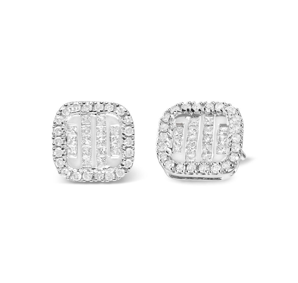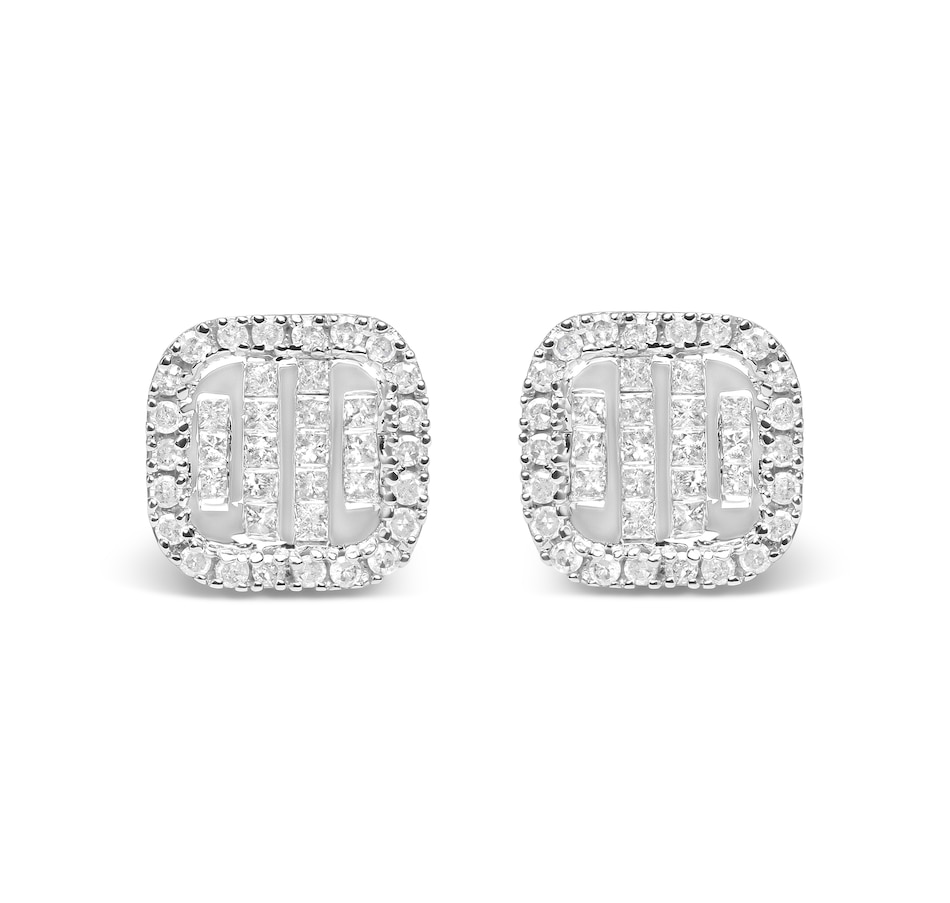 Introducing a stunning set of earrings, designed to make you feel like royalty. Each earring features a dazzling composite of 32 princess-cut diamonds, encircled by 44 round-cut diamonds in a halo setting. The 10K white gold metal perfectly complements the glittering diamonds, creating a luxurious and sophisticated look. Crafted with natural diamonds of I-J color and I1-I2 clarity, these earrings are truly a sight to behold. The intricate design is set with a total of 76 diamonds, weighing in at an impressive 7/8 cttw. The diamond details are carefully placed using a combination of invisible and prong settings, ensuring maximum sparkle and shine. Perfect for any occasion, these diamond stud earrings add a touch of elegance to any outfit. The push back earring finding guarantees a comfortable and secure fit. Indulge in the luxurious beauty of these composite and halo stud earrings, designed exclusively for women who appreciate the finer things in life.