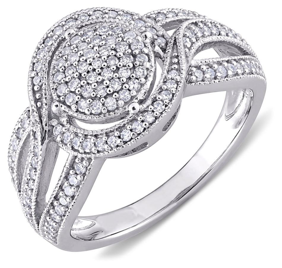 This exquisite interlaced clustered halo diamond engagement ring is crafted in lustrous 10-karat white gold and features 125 round-cut, pave-set glistening diamonds in a unique halo interlinked open design. The ring has been crafted to perfection with a high polish finish and is sure to make a standout addition to any jewelry collection. Choose this engagement ring for the woman you love as you celebrate this special milestone and begin the next chapter of your lives together.
