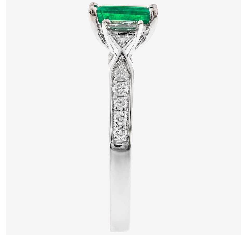 • (1) 7mm x 5mm emerald cut, prong set and faceted emerald (0.90 av. ctw)