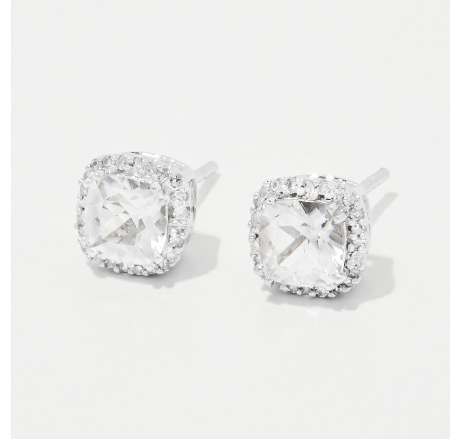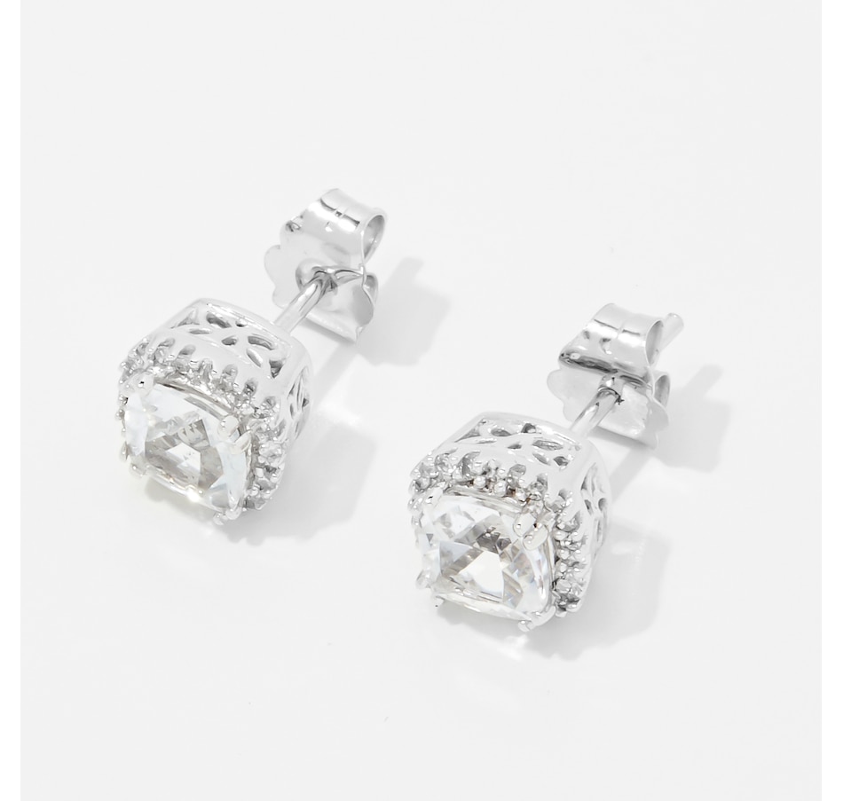 • (2) 5mm cushion cut, prong set and faceted white topaz (1.07 av. ctw)