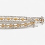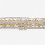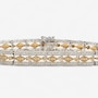 Elegant and intricately crafted, this lovely gold bracelet showcases a stunning interplay of texture, shape, and sparkle. Spanning just over 7 inches in length, the design features twenty-one links of warm rose gold and bright white gold, creating a rich visual contrast that enhances its vintage-inspired appeal. Each link is composed of a top and bottom row of four bead-set diamonds nestled within sleek white gold bars, creating a refined frame of brilliance.