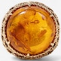 This striking yellow gold amber ring showcases a captivating round amber, glowing with warm, honeyed tones and held securely in a 6-prong setting. Surrounding the amber is a beautifully detailed, tightly bound rope border, adding texture and vintage charm to the bold centerpiece.