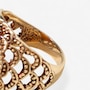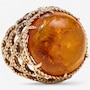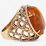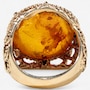 Flowing from the central setting, the tapered shoulders are adorned with an elegant scalloped, pierced draping design, arranged in six graduated rows, each delicately lined with tiny gold beads that enhance the ring’s intricate, ornamental quality. A single matching drape is also featured in the undergallery, adding a graceful flourish and showcasing the thoughtful craftsmanship from every angle. The true star of this piece is the amber, a fossilized tree resin that has been treasured for thousands of years.