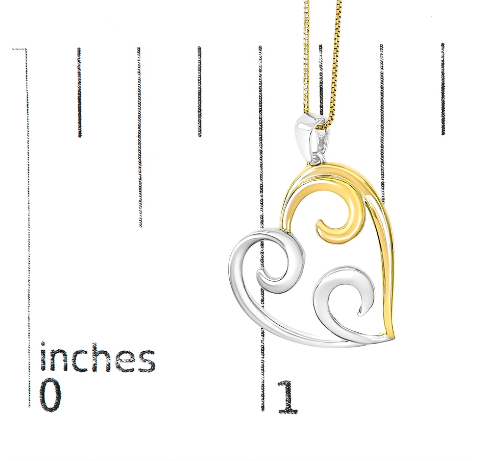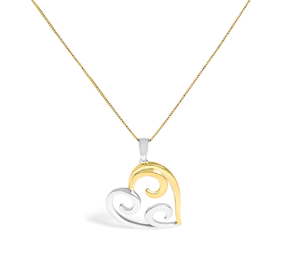 Celebrate someone you love with this stunning heart pendant. This pendant necklace features a flared open heart shape with swirls entering the center of the heart. The pendant comes with a slender 18” box chain for a sleek and modern look. It is very durable for its size and has a spring ring clasp. The contemporary yet classic 18" box chain complements any neckline beautifully. This authentic design is crafted of real 92.5% sterling silver that has been electro-coated with genuine 10K yellow gold, ensuring it will keep a tarnish-free shine for years to come. Both pretty and personal, this romantic heart pendant necklace is sure to radiate romance. This open heart design makes a perfect Valentine's Day gift, or as a way to remember someone close to your heart. It's a classic and feminine piece she'll want to show off every day.