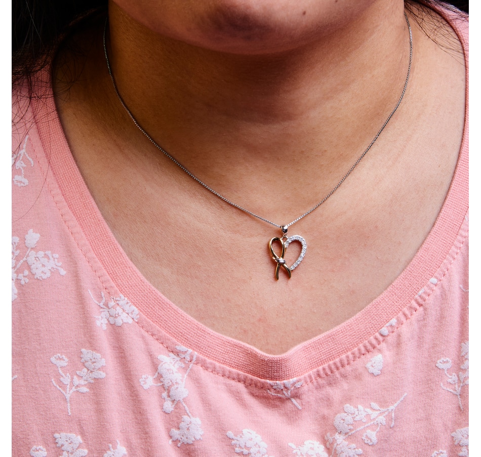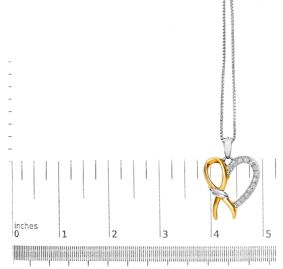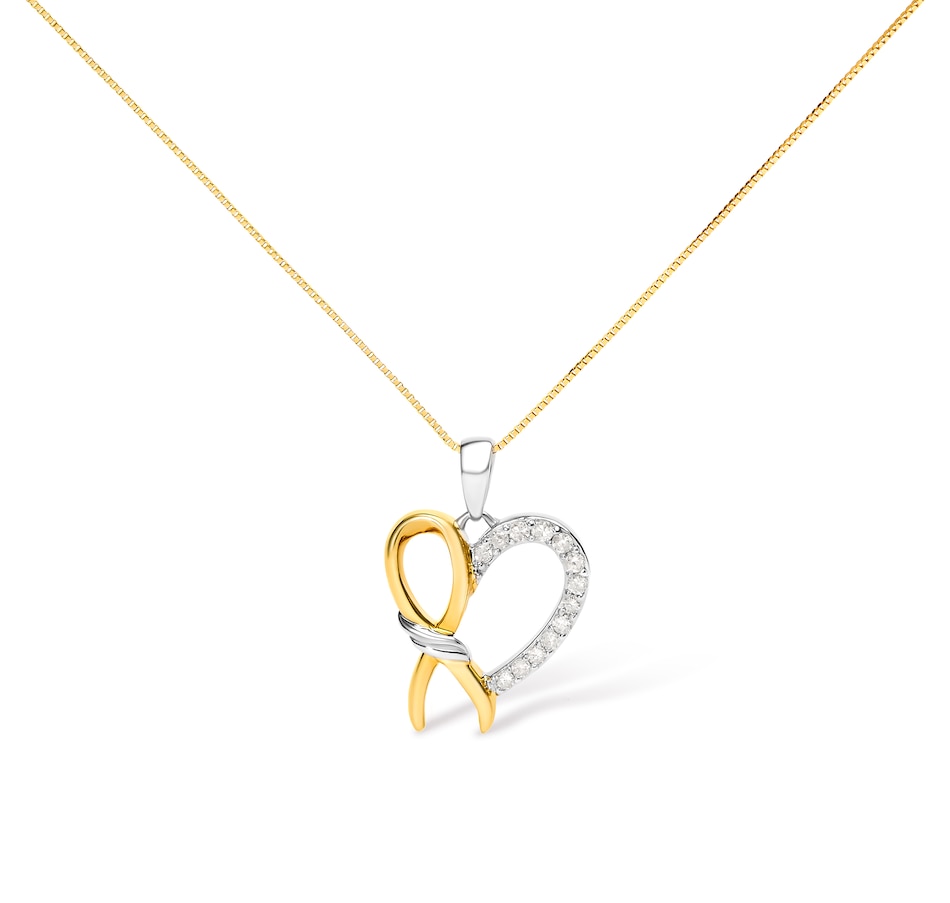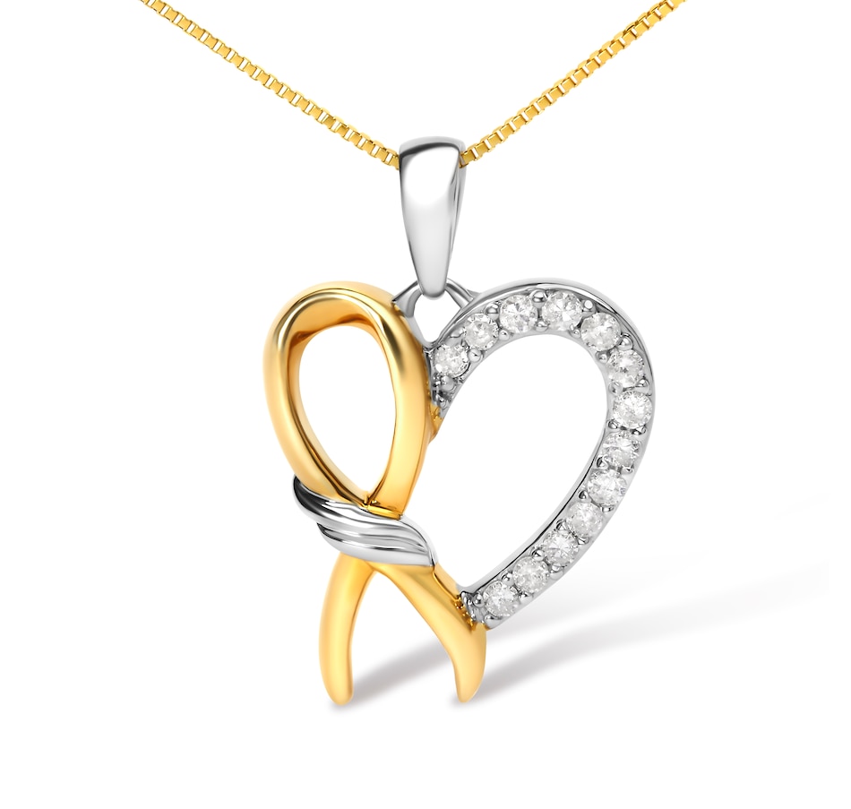 This heart pendant necklace is an ode to love and luxury. Crafted from 10K yellow gold plated .925 sterling silver, it radiates elegance and glamour. Adorned with 13 natural round diamonds totaling 1/5 cttw, the pendant is designed in a charming ribbon shape, symbolizing the unbreakable bond of love. The diamonds are prong-set to accentuate their H-I color and I2-I3 clarity. The pendant suspends from a 18" box chain with a secure spring ring clasp for effortless wear. A timeless piece that complements any attire and occasion, this necklace is a perfect gift for your loved one or a self-treat to cherish forever. With its exceptional craftsmanship and dazzling diamond details, this heart pendant necklace is a true expression of love and devotion.