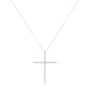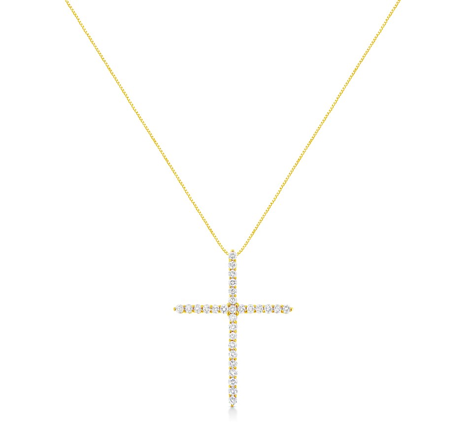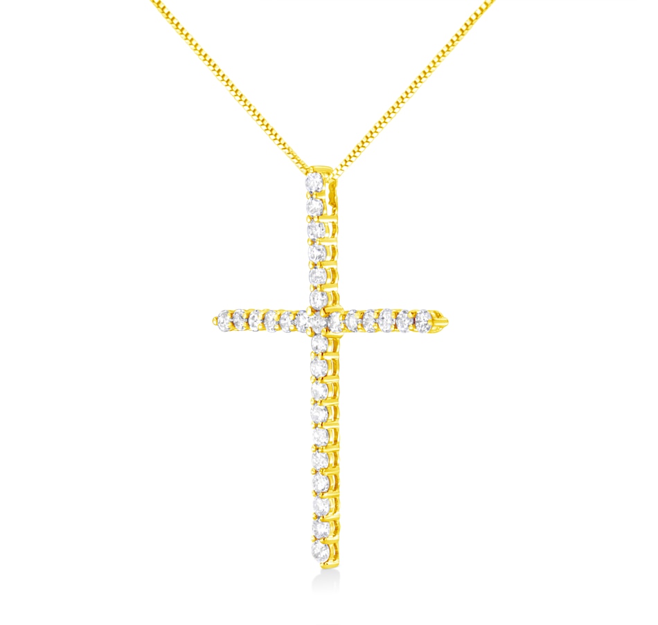 Share your faith with this stunning diamond cross pendant necklace. This cherished cross necklace for her, features 29 natural, round-cut diamonds set in 10k Yellow Gold Plated Sterling Silver. The pendant is suspended from an 18-inch box chain with spring ring. This fine jewelry cross necklace has a total diamond weight of 3.00 carats and is a contemporary classic. Color grade range is J-K and the clarity grade ranges from I2-I3.