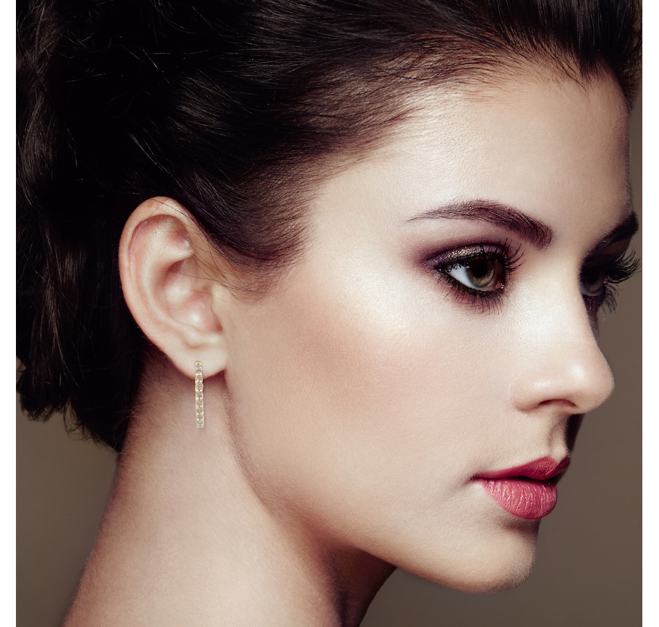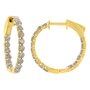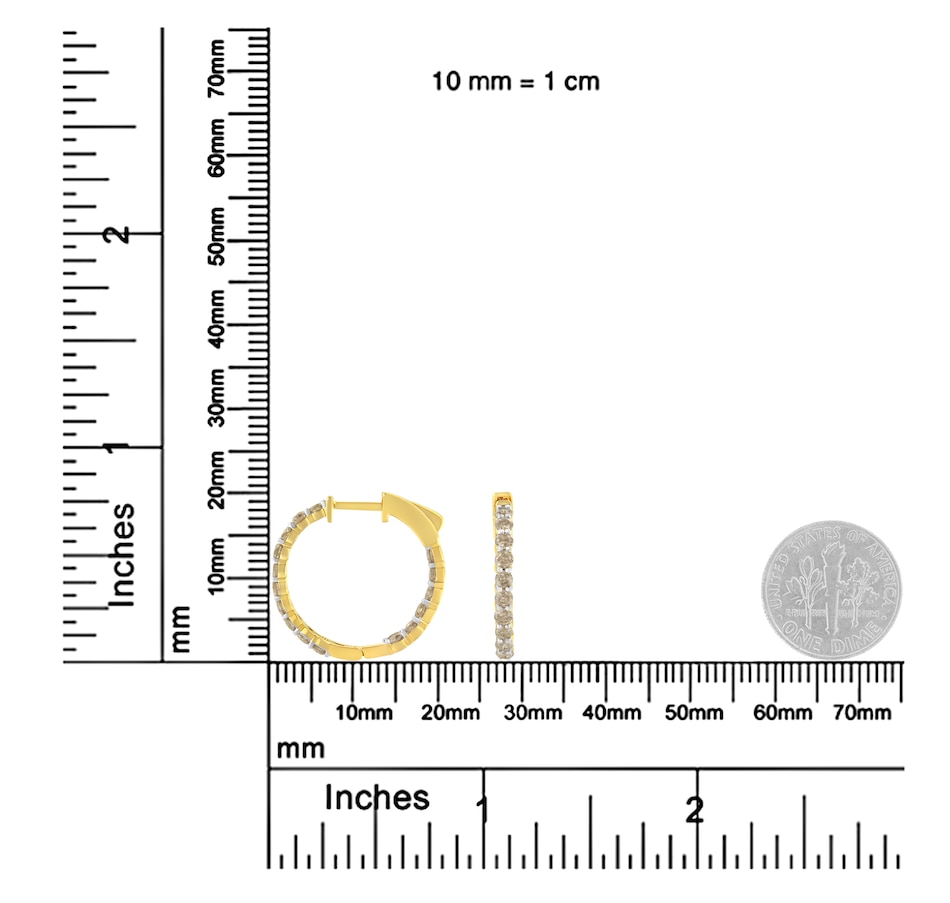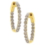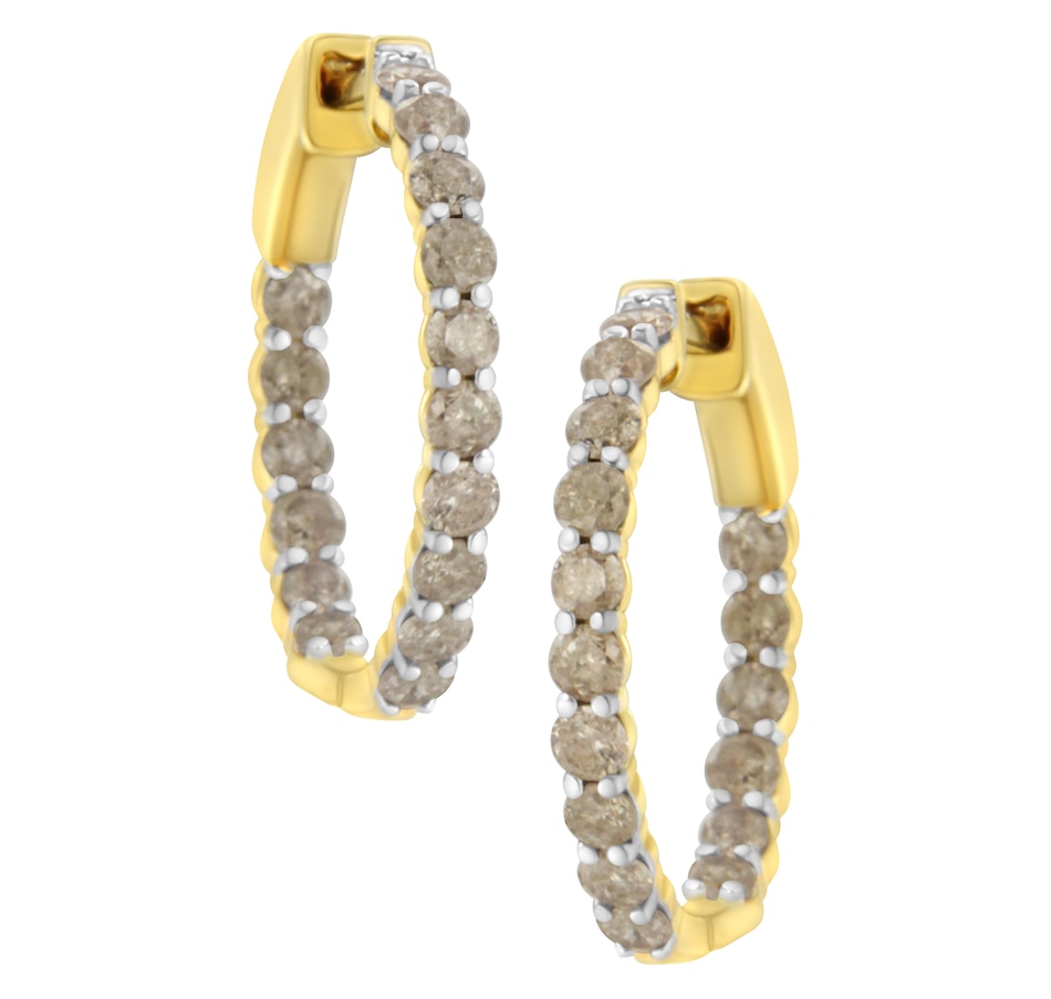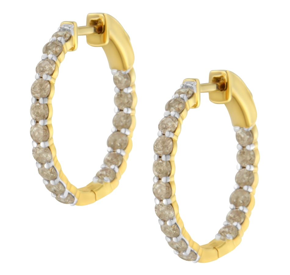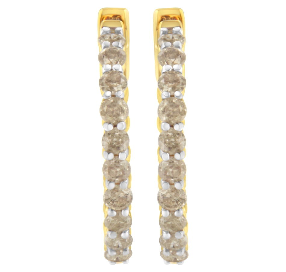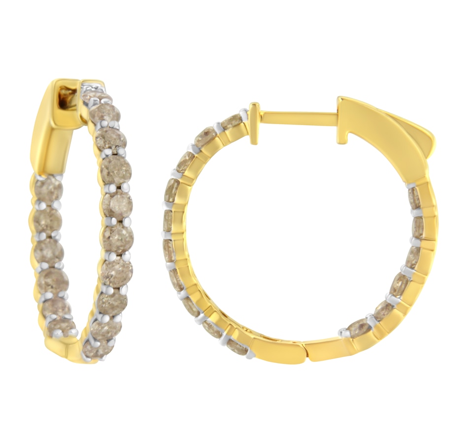 Trendy and chic diamond hoop earrings that are the perfect addition to any jewelry collection. Created in the finest 10k yellow gold plated sterling silver, this fabulous piece has round-cut diamonds on the outer and inner part of the earring. With a total diamond weight of 2 ct., this is the perfect accessory for any occasion.