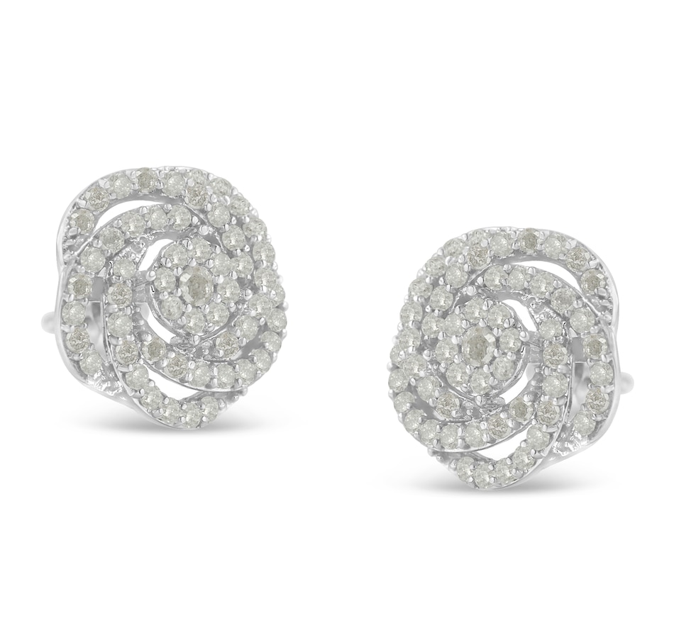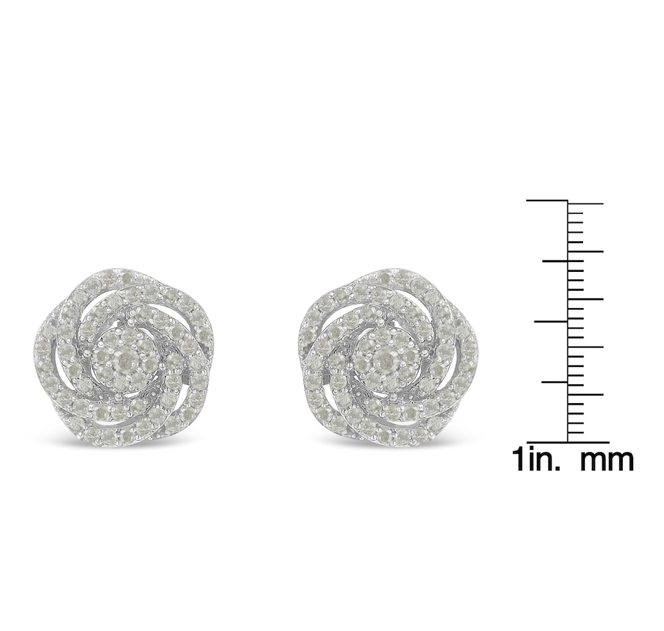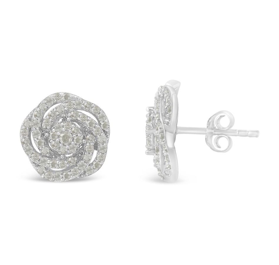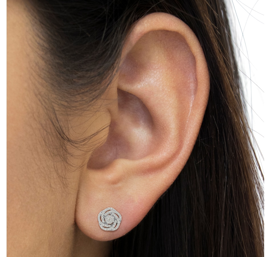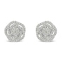 Delicate flower stud earring with a modern design that resembles a rose. The structure is made with 10k white gold and it features 108 round-cut genuine diamonds in a prong setting. The total diamond weight is 1/2ct. This fine jewelry piece is extremely sparkly and it is suitable for both, casual and formal events. It comes with a screw back, as well free gift packaging.