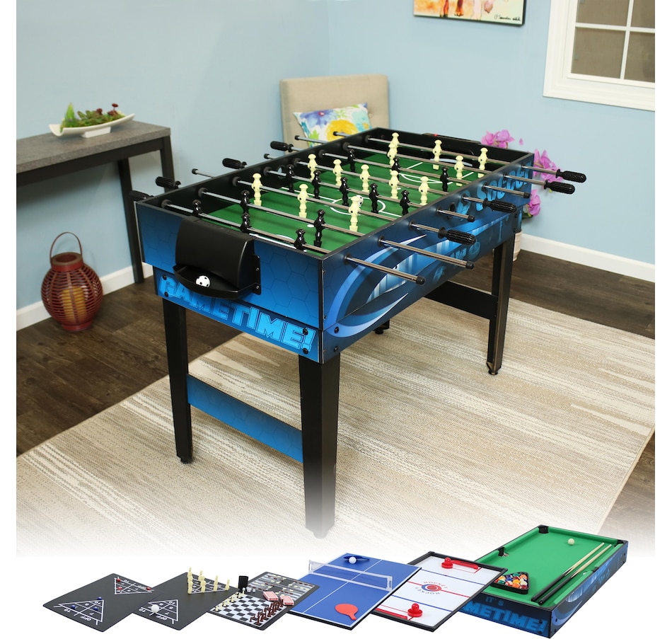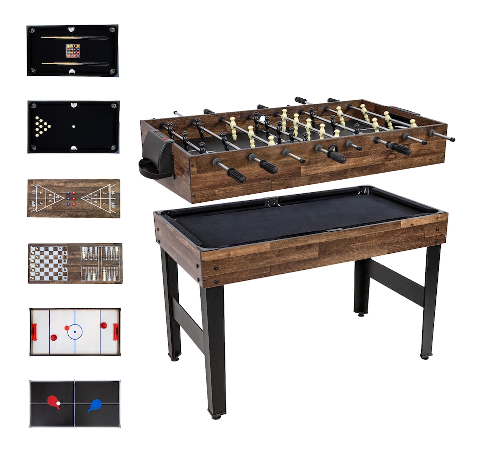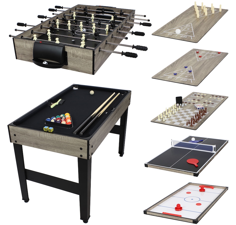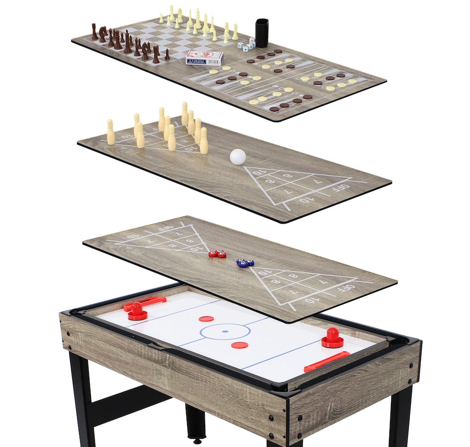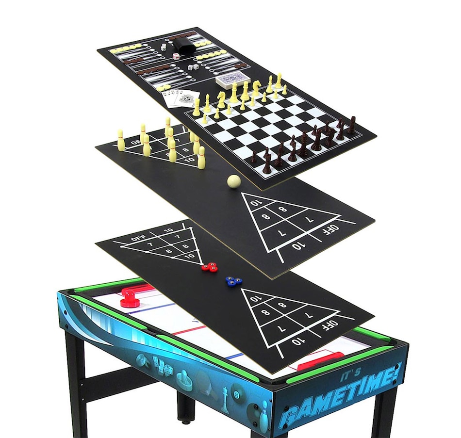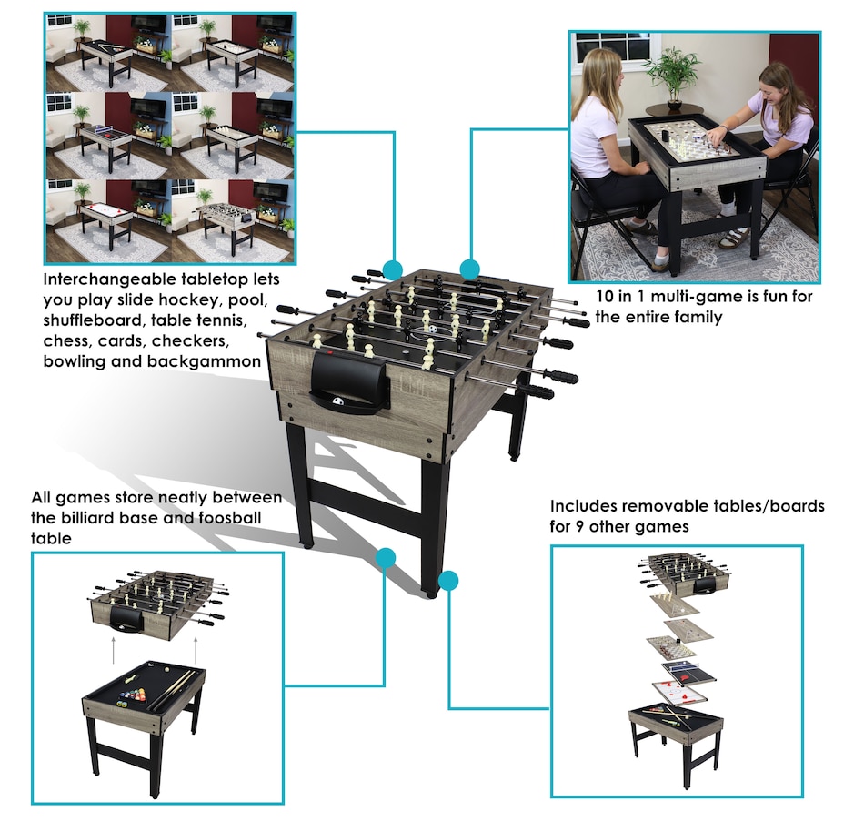 This 10-in-1 multi-game table for kids is a wonderful indoor game center for friends and family. Keep everyone entertained for hours on end with a combo game table set, especially during storms or cold weather for a fun night in. With multiple games to choose from, loved ones will always have a way to spend time together. This multi-game table for adults and kids is great for switching back and forth between sports to quickly start a new game once tired of the current game. This game table features ten classics including billiards, foosball, hockey, table tennis, shuffleboard, chess, checkers, cards, backgammon, and bowling. Plus, the comfy, easy-to-grip handles on the foosball table will make scoring the winning goal a breeze. It's easy to keep track of who's winning with the manual scorer located on each side of the table. With everything it has to offer, this kids game table combo offers plenty of fun for the family.