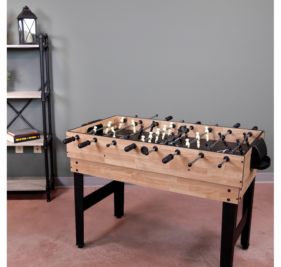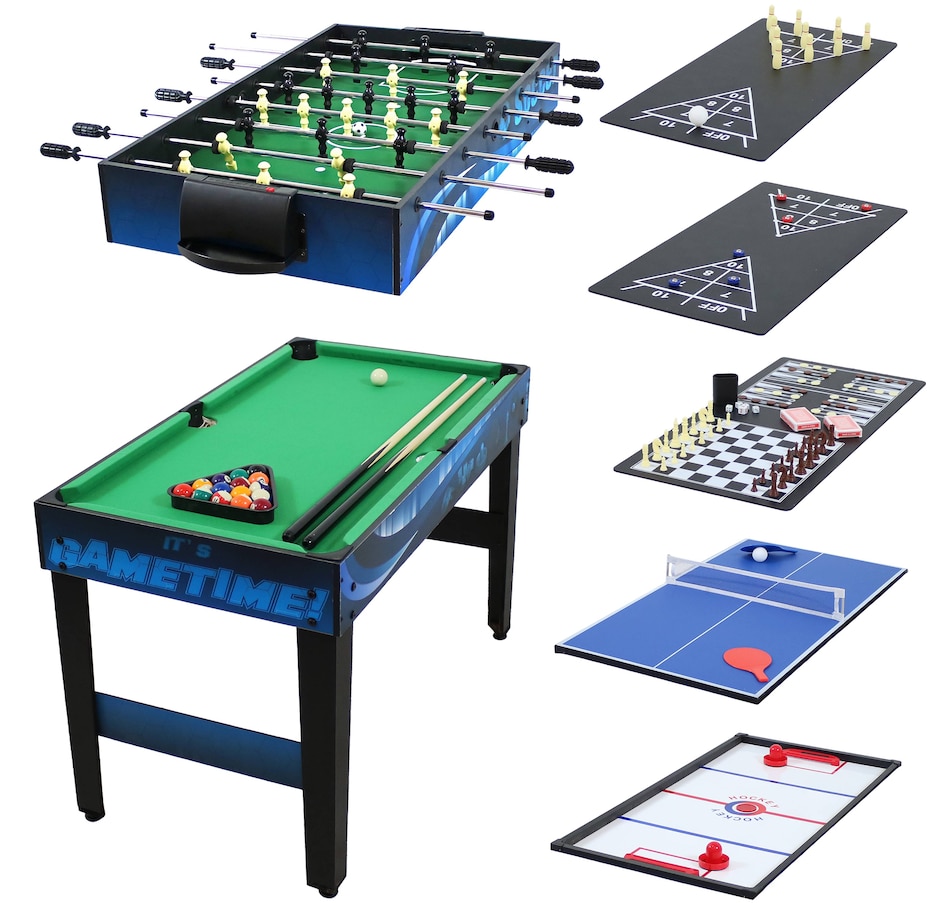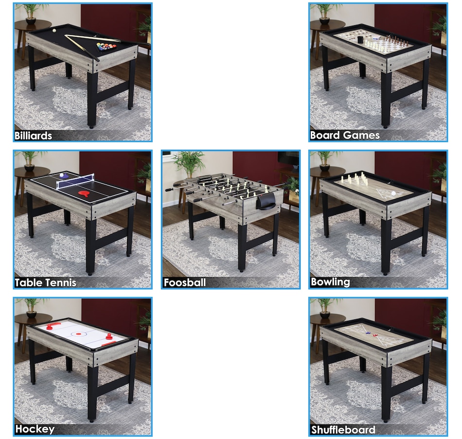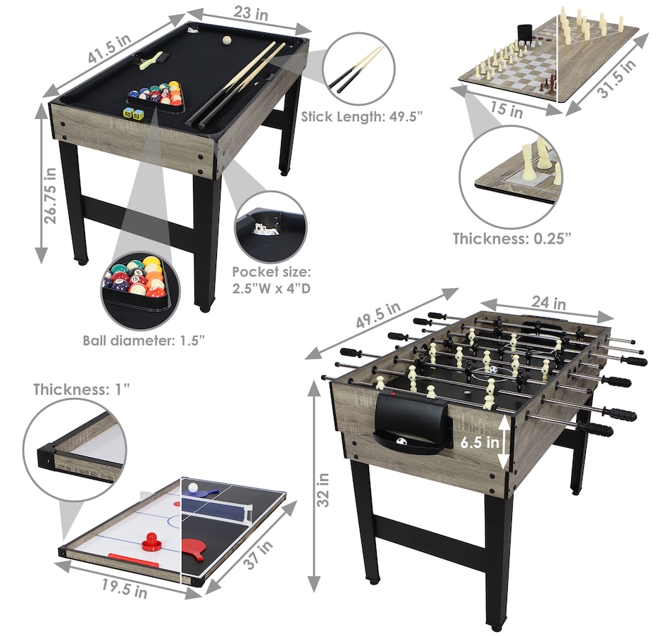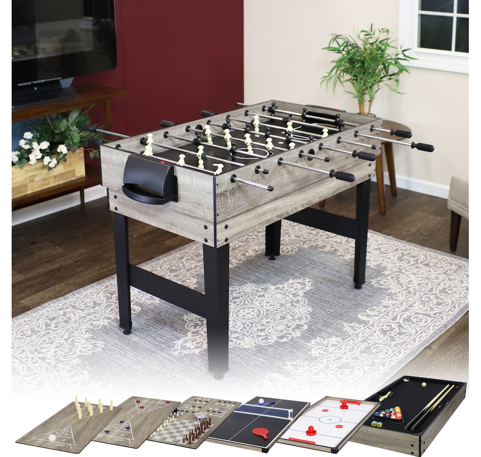 This 10-in-1 multi-game table for kids is a wonderful indoor game center for friends and family. Keep everyone entertained for hours on end with a combo game table set, especially during storms or cold weather for a fun night in. With multiple games to choose from, loved ones will always have a way to spend time together. This multi-game table for adults and kids is great for switching back and forth between sports to quickly start a new game once tired of the current game. This game table features ten classics including billiards, foosball, hockey, table tennis, shuffleboard, chess, checkers, cards, backgammon, and bowling. Plus, the comfy, easy-to-grip handles on the foosball table will make scoring the winning goal a breeze. It's easy to keep track of who's winning with the manual scorer located on each side of the table. With everything it has to offer, this kids game table combo offers plenty of fun for the family.