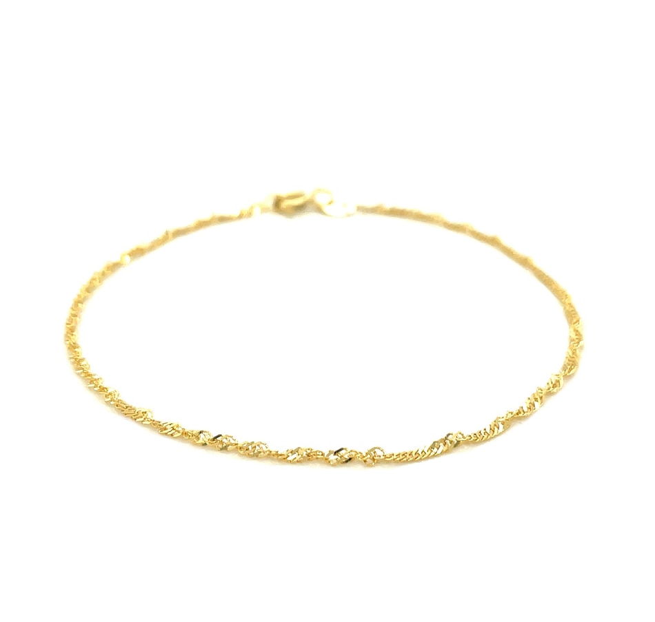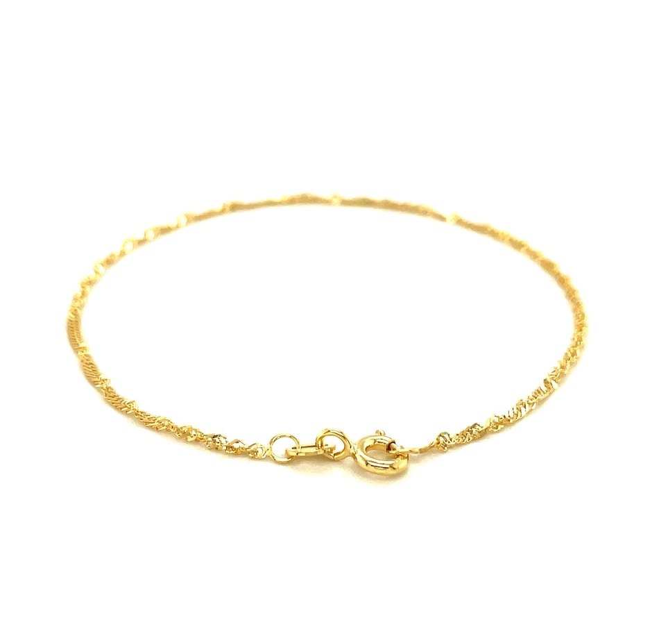 Crafted in glistening 10k yellow gold, this Singapore anklet has a width of 1.5 millimeters and is secured with a spring ring clasp.