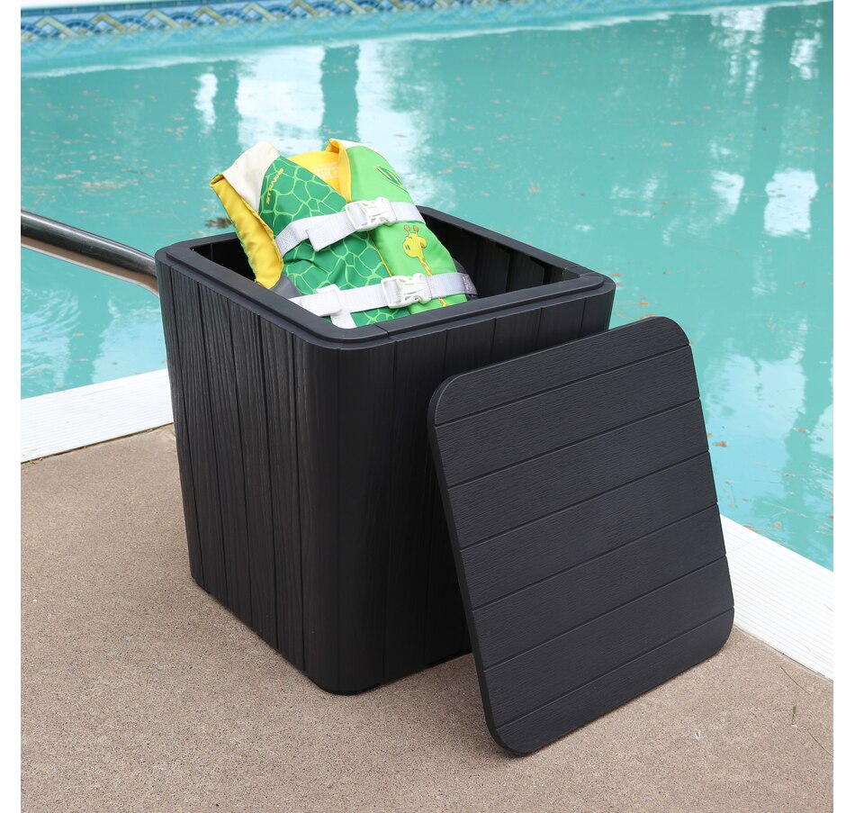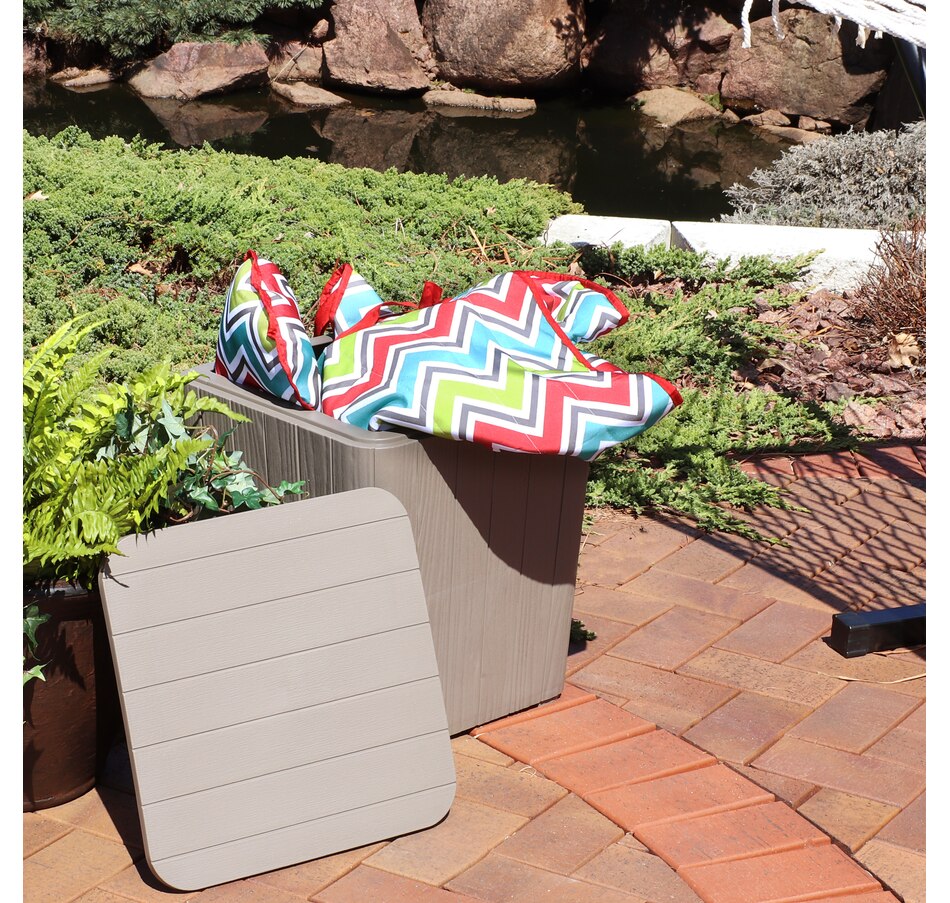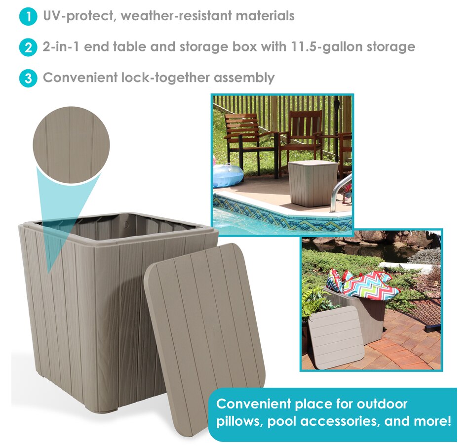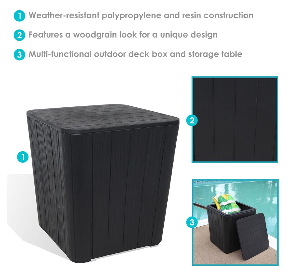 Make the most of any patio space with this multi-functional outdoor deck box and storage featuring a convenient tabletop. This deck box features a UV-protected and weather-resistant polypropylene and resin construction with a woodgrain look designed to complement any outdoor space while remaining durable against the outdoor elements. This storage box is the right height to use as a side table next to any patio or poolside furniture for easy storage of pool items and pillows while being able to set down your cool drink on top. The storage box is easy to assemble and designed to protect pillows, pool accessories, outdoor tools, decor and more! Keep all your favorite things safe this this storage box: stow away seasonal decorations,or other tools and items you want to have on hand with this woodgrain designed and weather-resistant storage box.