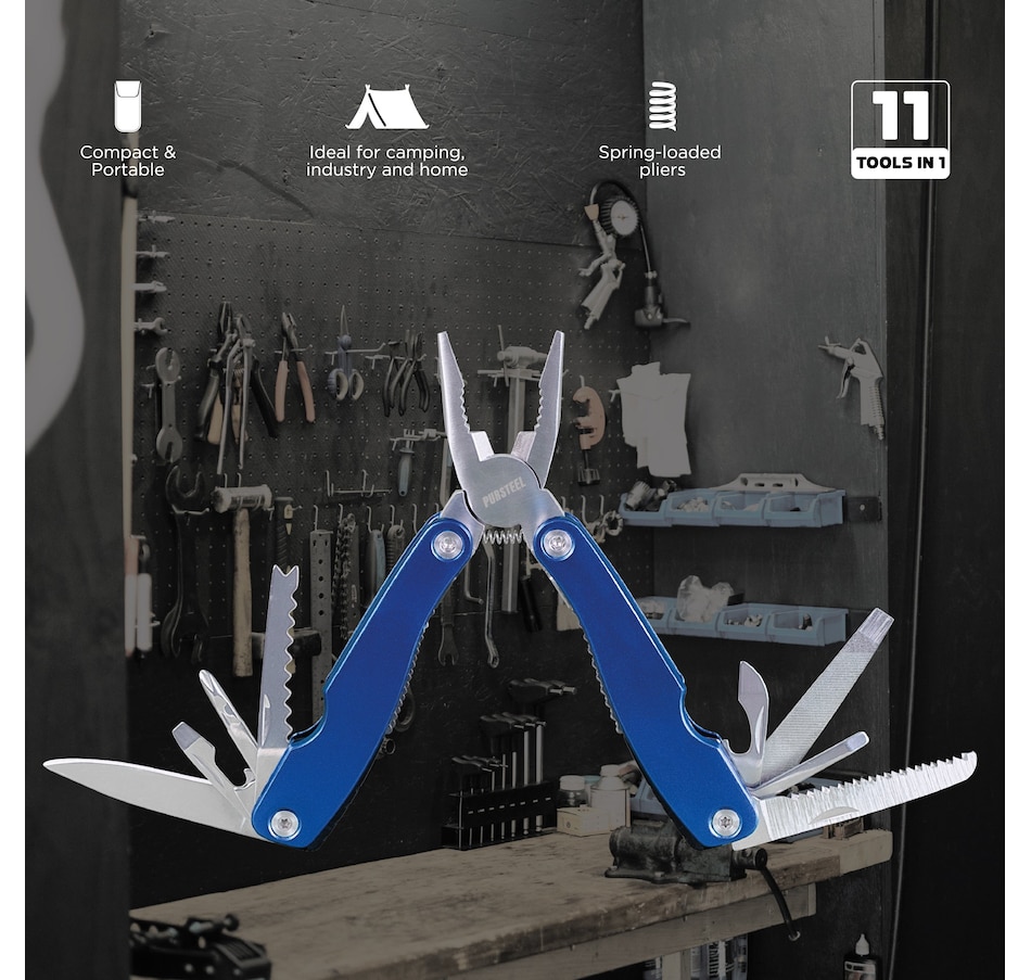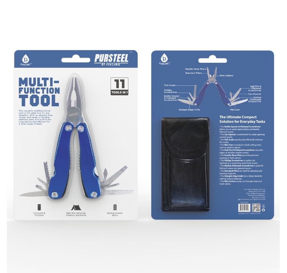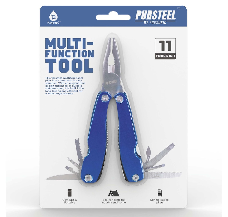 Simplify your toolbox with the Pursonic 11-in-1 Multifunction Tool, a compact and versatile gadget that combines practicality with durability. Perfect for DIY projects, camping, fishing, or everyday tasks, this all-in-one tool offers essential features to handle a wide variety of situations, making it a must-have for any toolkit or outdoor adventure.Key Features:Bottle Opener & Flat Head Screwdriver: Easily open bottles or handle flathead screws with this dual-purpose tool.Can Opener: A convenient feature for camping trips or kitchen emergencies.Fish Scaler: Clean and prepare your catch with the integrated scaler.Mini Saw: Ideal for small cutting tasks, whether in the outdoors or at home.Nail File & Flat Head Screwdriver: Keep nails groomed or tackle small flathead screws effortlessly.Needle Nose Pliers: Precision pliers for delicate gripping tasks, perfect for intricate projects.Phillips Screwdriver: Handle crosshead screws with ease, ensuring versatility for a variety of jobs.Slotted Flathead Screwdriver: A larger flathead option for tackling standard screws.Standard Pliers: Durable pliers for gripping, bending, or holding materials securely.Straight Edge Knife: A sharp blade for cutting tasks, from slicing cords to opening packages.Wire Cutters: Cleanly cut wires for electrical projects or quick fixes.Additional Benefits:Compact and Portable: Lightweight design fits easily into pockets, backpacks, or toolkits, making it travel-friendly.Durable Construction: Crafted from high-quality stainless steel for long-lasting performance and resistance to rust.Ergonomic Grip: Comfortable handle ensures a secure and slip-resistant grip, even during extended use.Multi-Purpose Use: Ideal for camping, fishing, DIY tasks, emergencies, and everyday needs.Why Choose the Pursonic 11-in-1 Multifunction Tool?This tool provides the perfect balance between functionality and convenience, saving you time and effort by consolidating essential tools into one compact device. Whether you’re out in the wilderness or tackling household repairs, the Pursonic 11-in-1 Multifunction Tool is your reliable companion.Upgrade your toolkit today—order the Pursonic 11-in-1 Multifunction Tool and be ready for anything life throws your way!