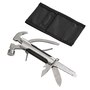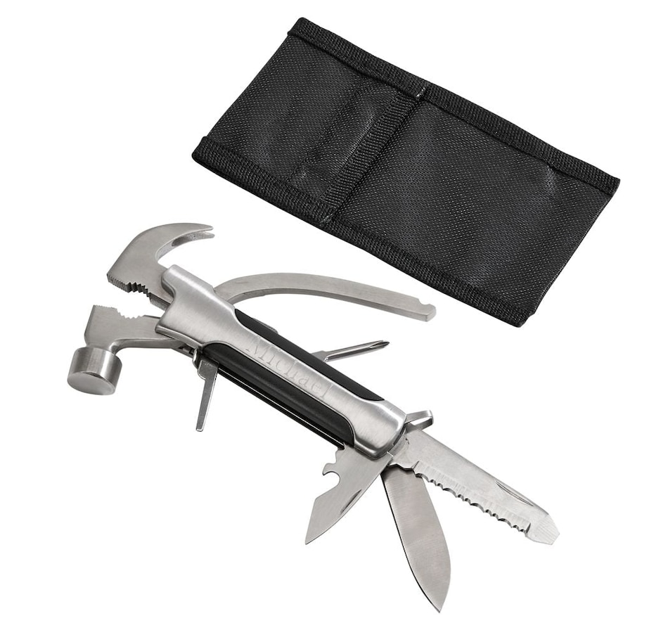 Looking for a gift that is stylish as well as functional and practical and looks great with a name or monogram? Look no further than our stainless steel hammer and multifunction tool. This tool has it all, 10 tools in 1, a hammer, pliers, 2.5" blade, 2.5" saw blade with file, flat head screwdriver, Phillips head screwdriver, bottle opener, reamer and wire cutter. 5.25" L x 3" W, includes black pouch. Black Gift Box.