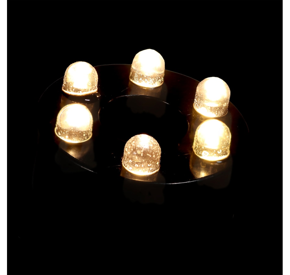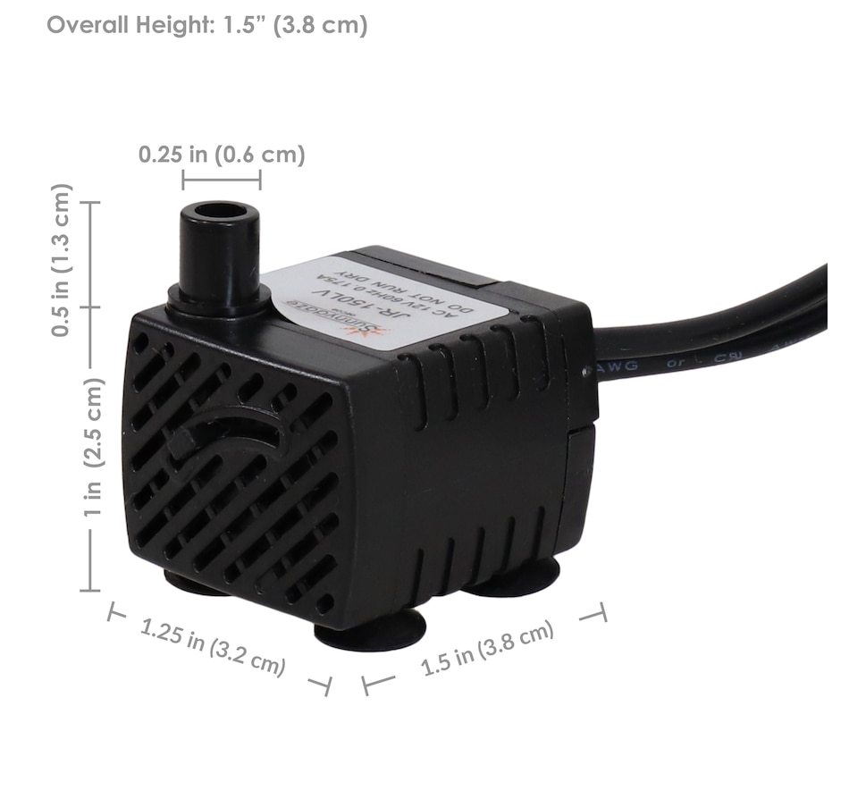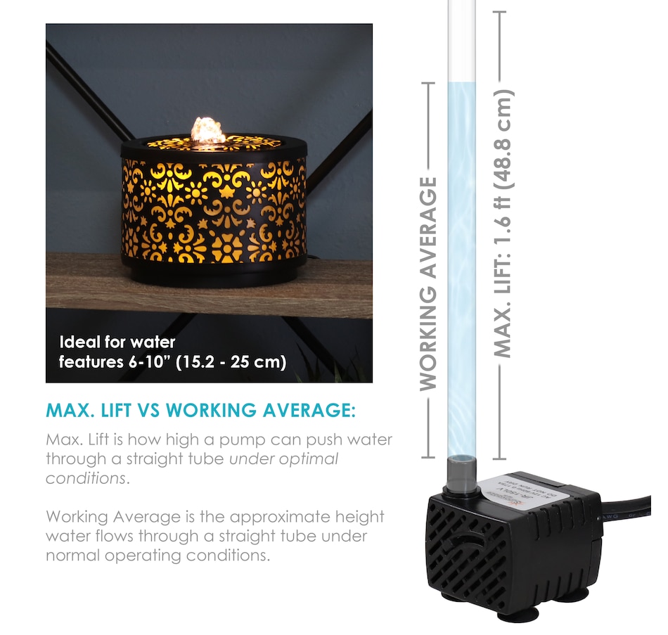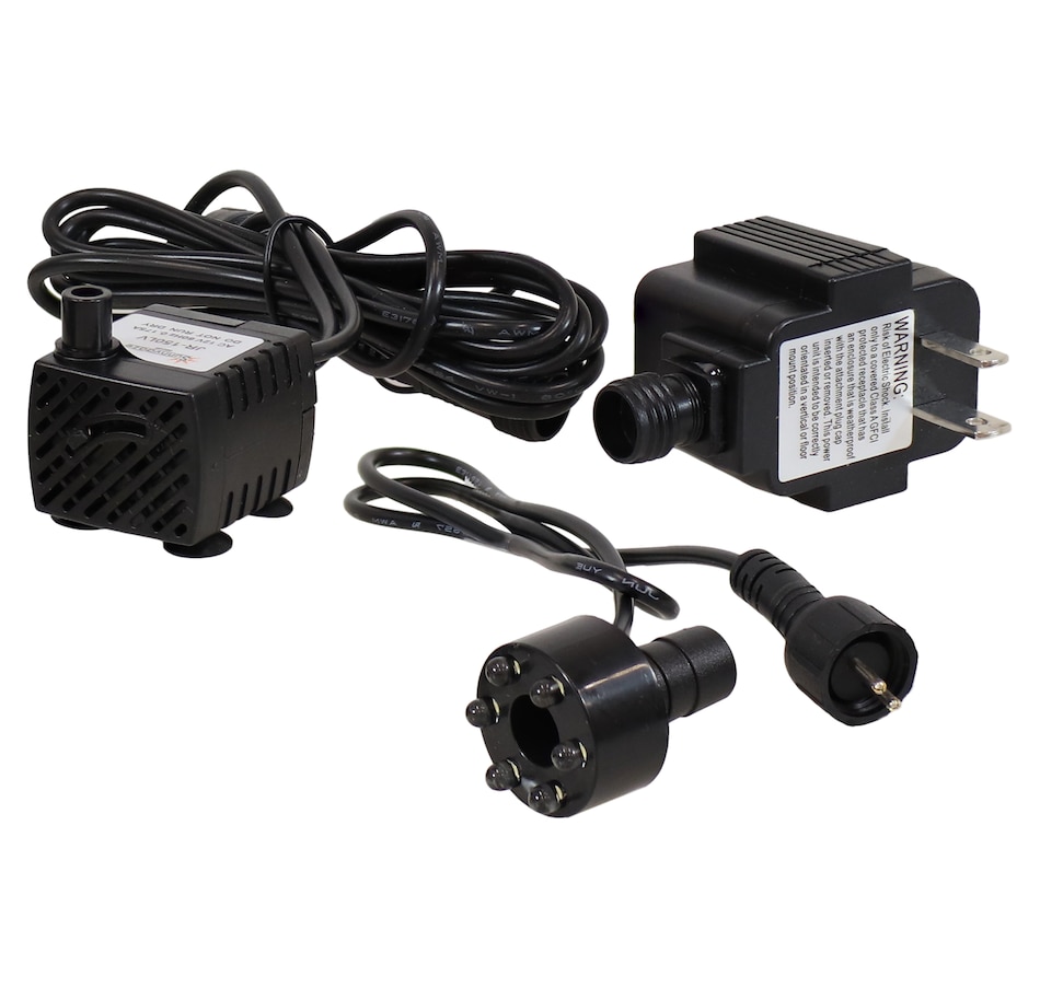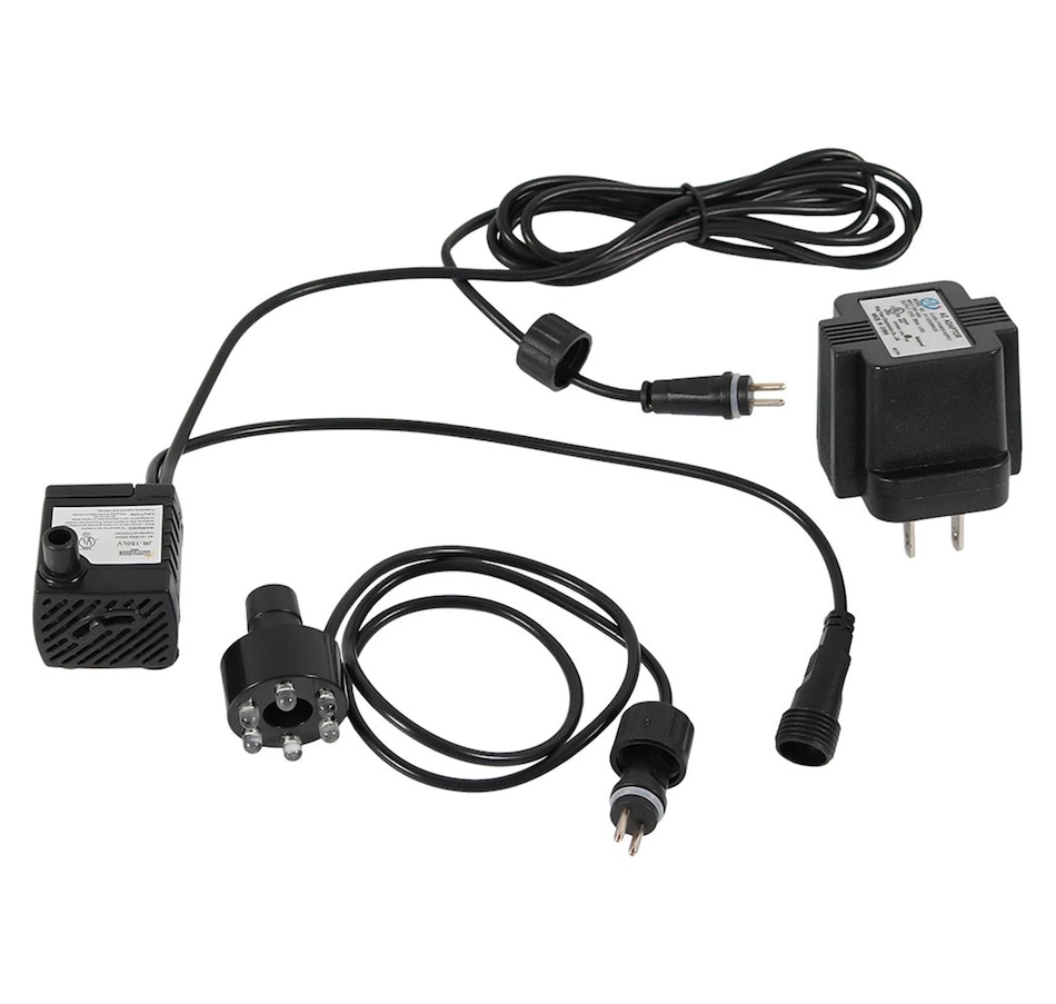 Give a small fountain or bird bath the beautiful illumination and radiance it has been missing with the 12-volt electric fountain pump with a 6-bulb white LED light ring. Each purchase includes a 6' long electrical cord with endless options as well as a 21" cable that connects the small fountain pump to the 6-bulb LED light ring. The built-in adjustable flow rate valve located on the front of the pump gives the option to easily adjust the water flow and generate a relaxing effect in any outdoor space. This pump will brighten up any space with beautiful and relaxing water soundscapes while effortlessly keeping the mosquitos and other unwanted pests away. All internal electrical mechanics are protected by an encased plastic cover.