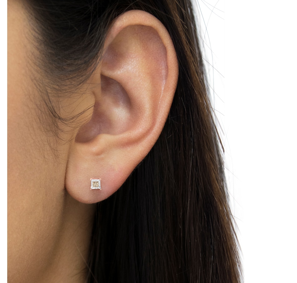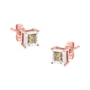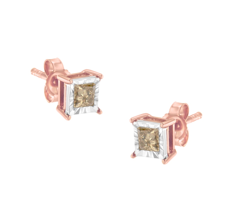 This charming pair of diamond studs features miracle set princess cut diamonds. The unique design is crafted in 2 micron plated rose gold plated sterling silver making them the perfect acessory to add sparkle to any outfit. The total diamond weight is 1/2 carat.