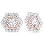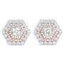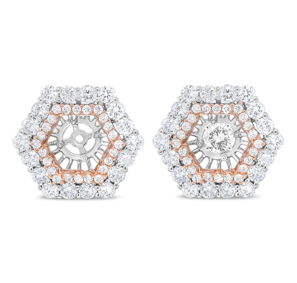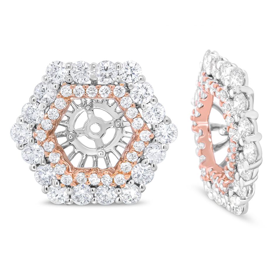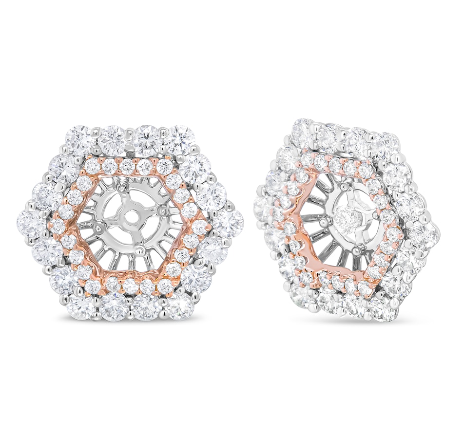Upgrade your existing stud earrings with the sensational halo style of this diamond earring jacket that fits earrings up to 6 MM. A dazzling two tone look comes from the genuine 14k rose and white gold metal. A double hexagonal halo will dazzle your personal center stone, comprised of round white diamonds in prong settings. The diamonds shape grows from larger to smaller in an eye-catching effect. These earring jackets provide a stunning look, with a total of 1 7/8 cttw diamonds with an approximate G-H color and VS2-SI1 clarity.