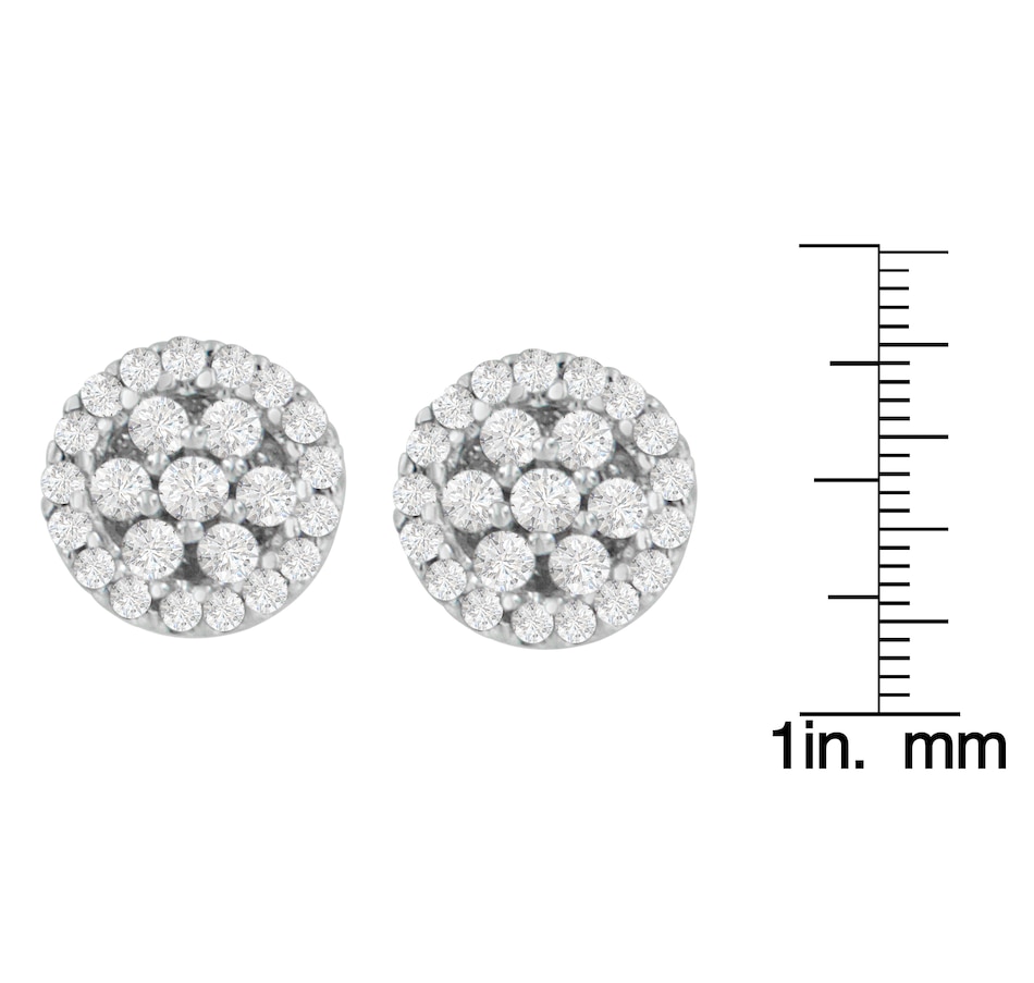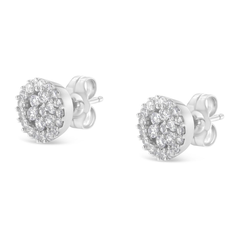 Elegant and timeless, these 14K white gold stud earrings feature round, brilliant cut diamonds in a halo style button shape. The earrings have three circular rows of diamonds with your choice of either ½ or 1.0 carat total weight worth of diamonds. The earrings feature pushback closures with notched posts and friction backs that keep these pierced earrings safe and secure on your ears for comfortable, worry-free wear all day long. This authentic design is crafted of real 14 karat gold, a precious metal that will keep a tarnish-free shine for years to come. These classic earrings make a great gift for any special occasion! Diamonds are thought to give the wearer clarity and illuminate solutions to life’s problems. These stud style floral cluster earrings are subtle enough for casual affairs but sparkle in formal settings as well. Coordinate these earrings with your favorite diamond necklace or other diamond jewelry to create a complete elegant ensemble.