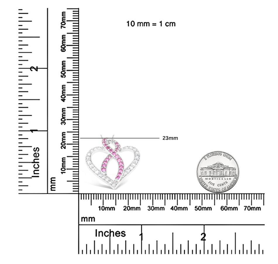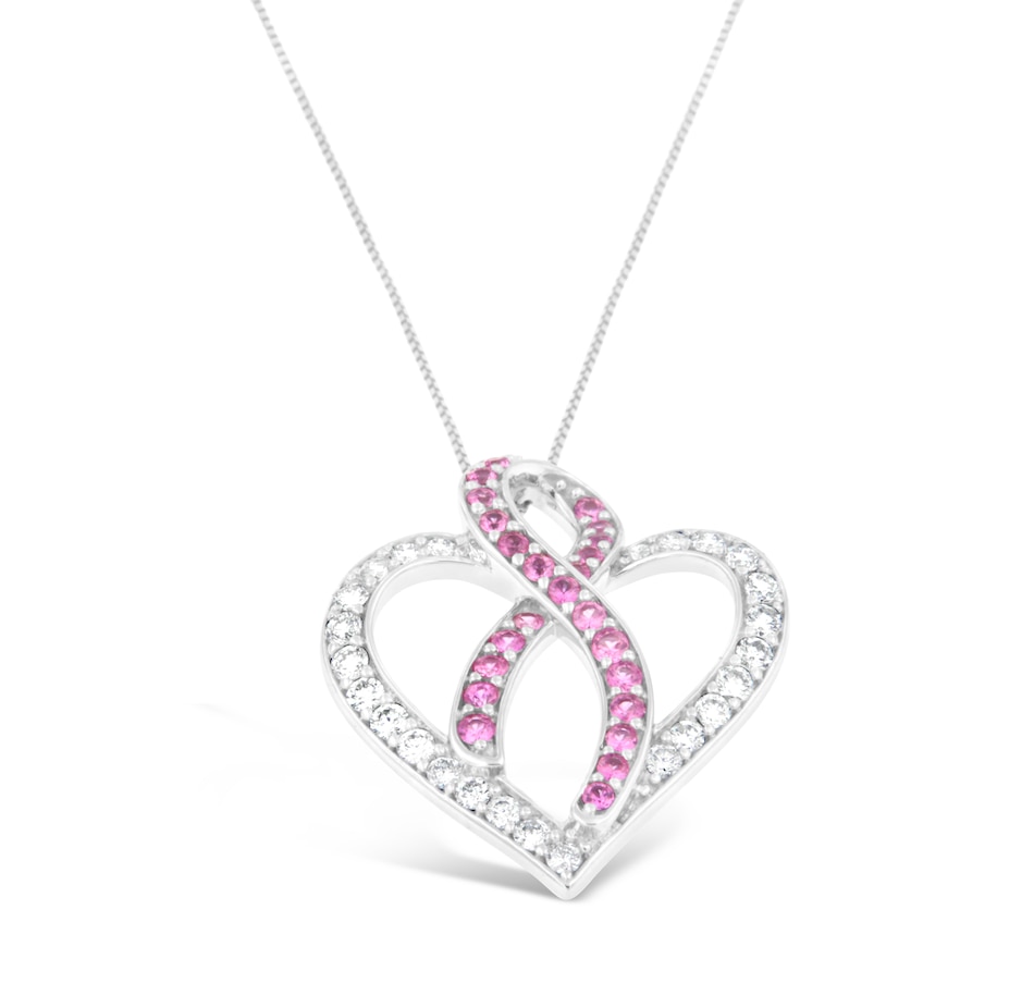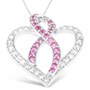 This romantic yet radiant necklace is suspended from 14 karats white gold. It is formed in the shape of an interwoven ribbon and heart. The lovely heart is embellished with sparkling round cut diamonds, and the ribbon design is decorated with beautiful, lab created pink sapphire gemstones, which adds an extra touch to its look.