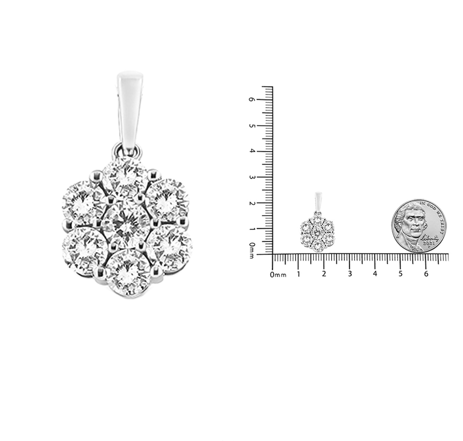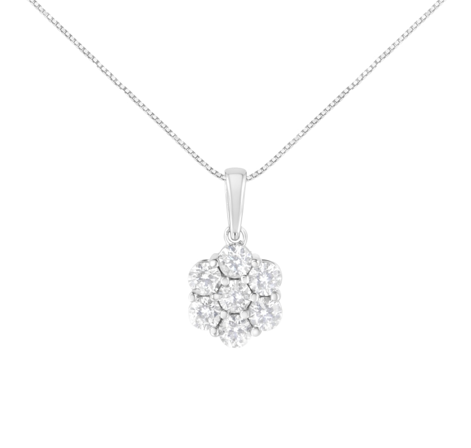 Chic and trendy, this elegant 14k white gold pendant has a floral design set with 7 round-cut, natural diamonds in a prong setting. The diamonds shine and has an impressive total carat weight of 2 cttw. The floral motif hangs from a 18" gold box chain. Gift this to a loved one on any special occasion, or treat yourself, this pendant is a lovely investment.