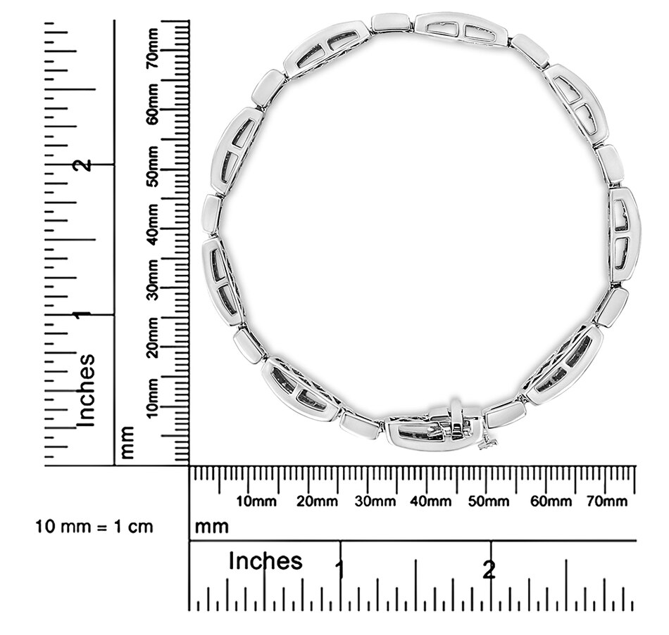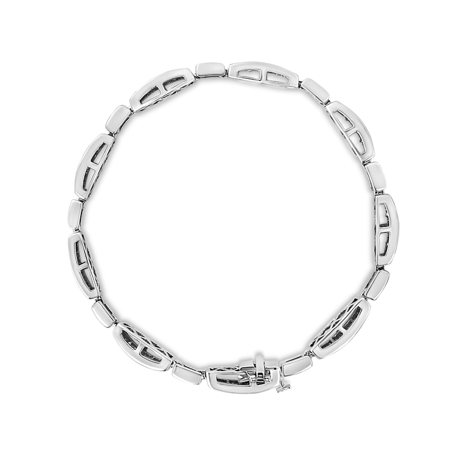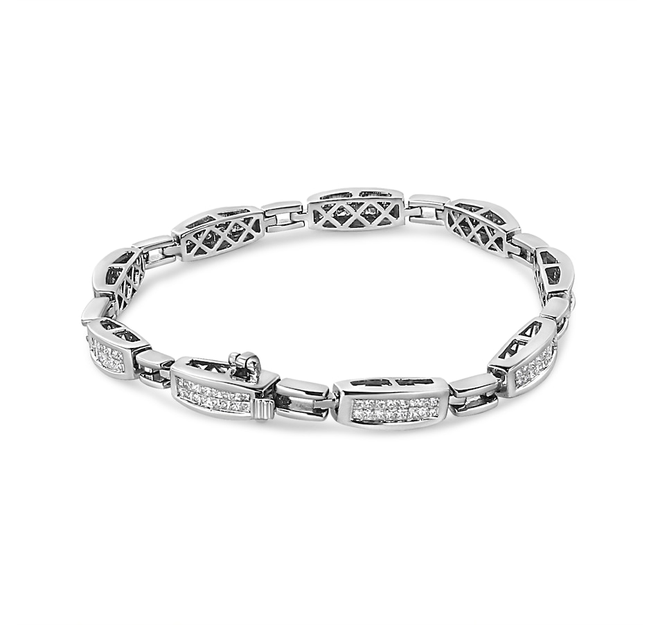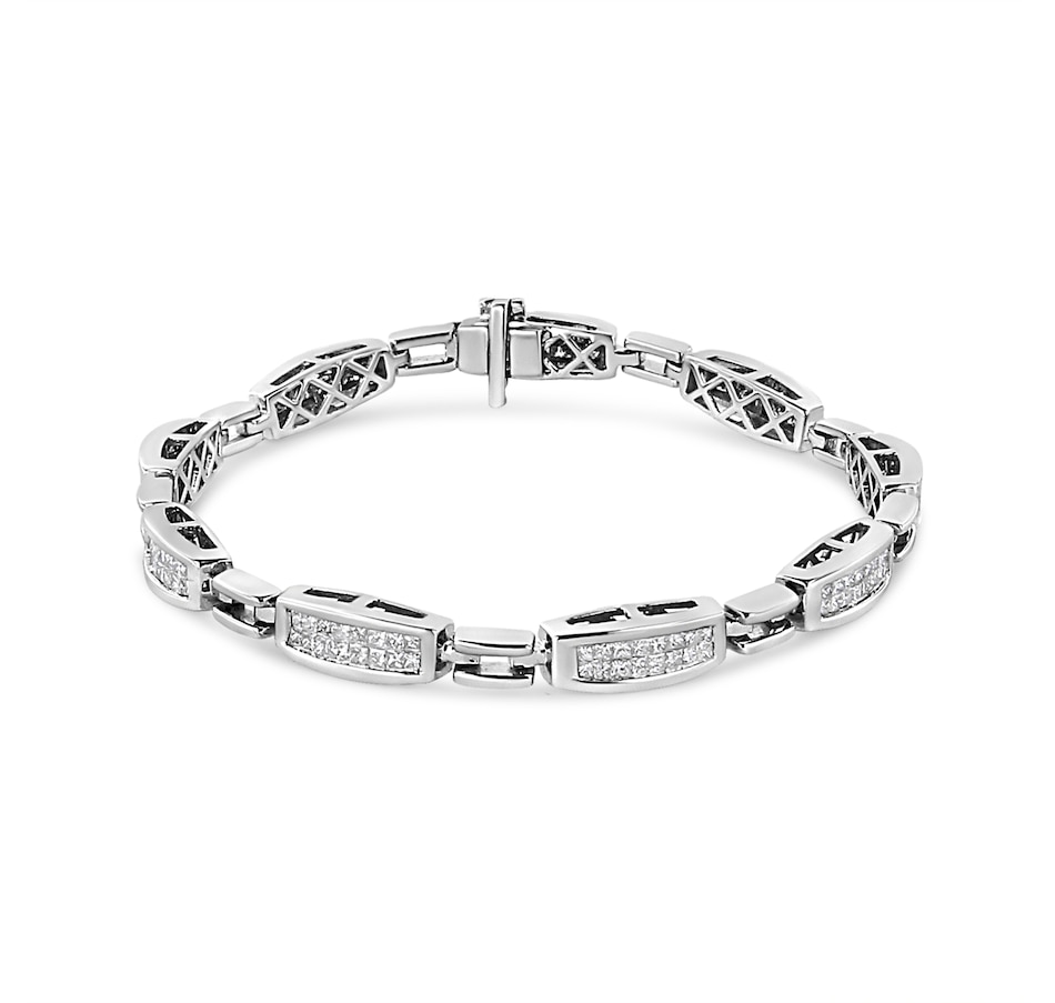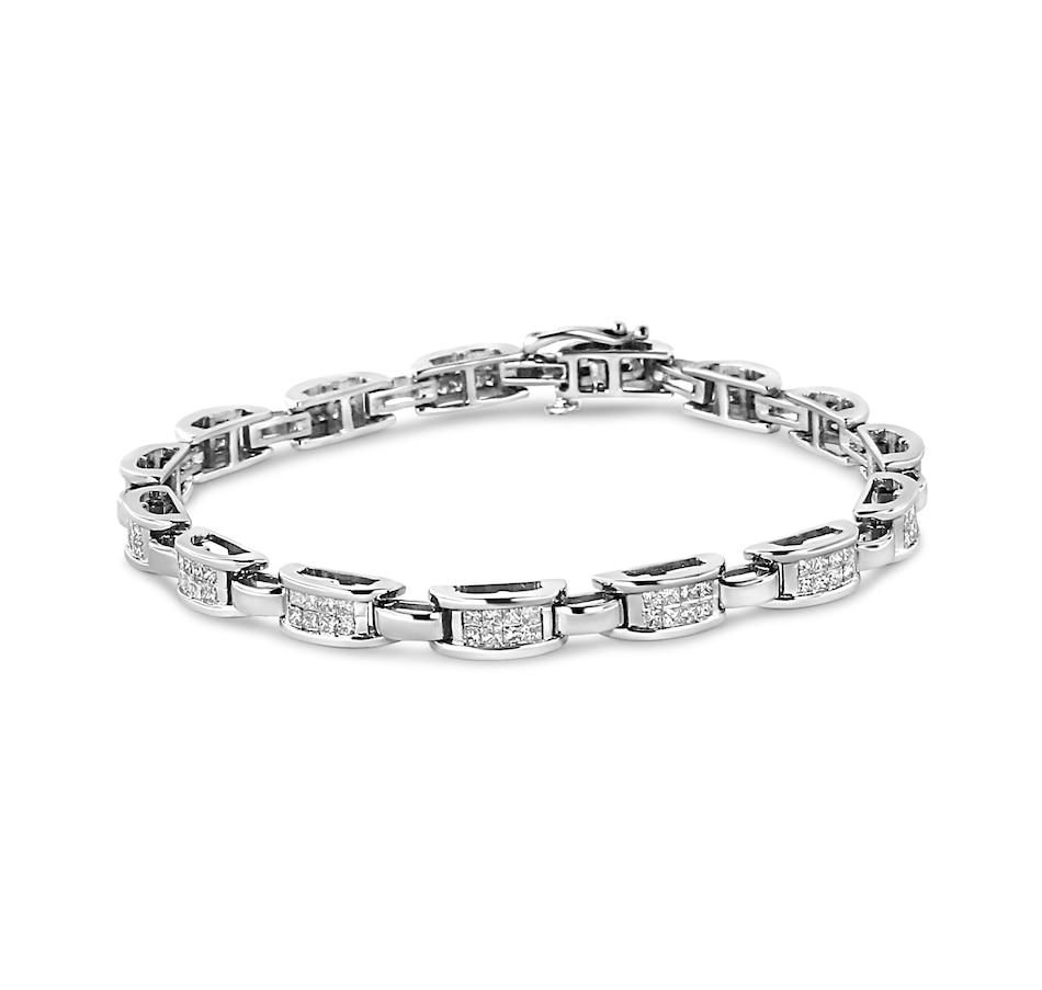 Shower her with diamonds and the timeless sparkle of this diamond link bracelet. The beauty of this bracelet is structured to deliver awe-inspiring contemporary elegance with spectacular contours that wrap the band of the bracelet in panoramic beauty. This design features princess cut diamonds that gleam from rectangular frames. The invisible setting uses a most intricate technique to showcase the diamonds in their purest form so that way all you see is the sparkling allure of the stones alongside the striking beauty of the precious metal. The diamonds in this bracelet are of a total 2.00 cttw and are of approximate I1-I2 clarity and I-J color. This glorious composition of style offers exceptional design elements that will truly impress design aficionados! Crafted of genuine 14k white gold, this bracelet is perfect for lasting beauty with metal that will stay tarnish free for years to come. Secures via box with clasp for secure wearing. It is 7.25 inches long, best suited for small and medium sized wrists.