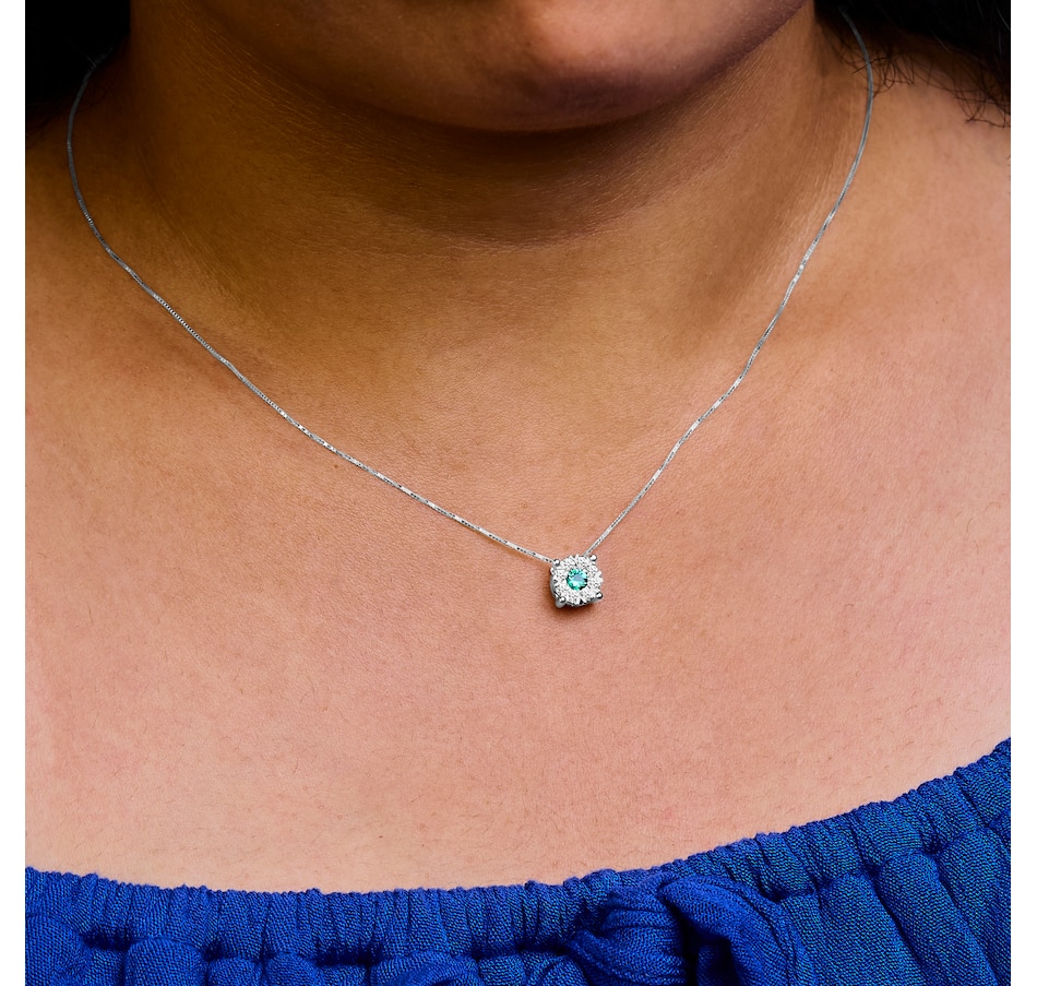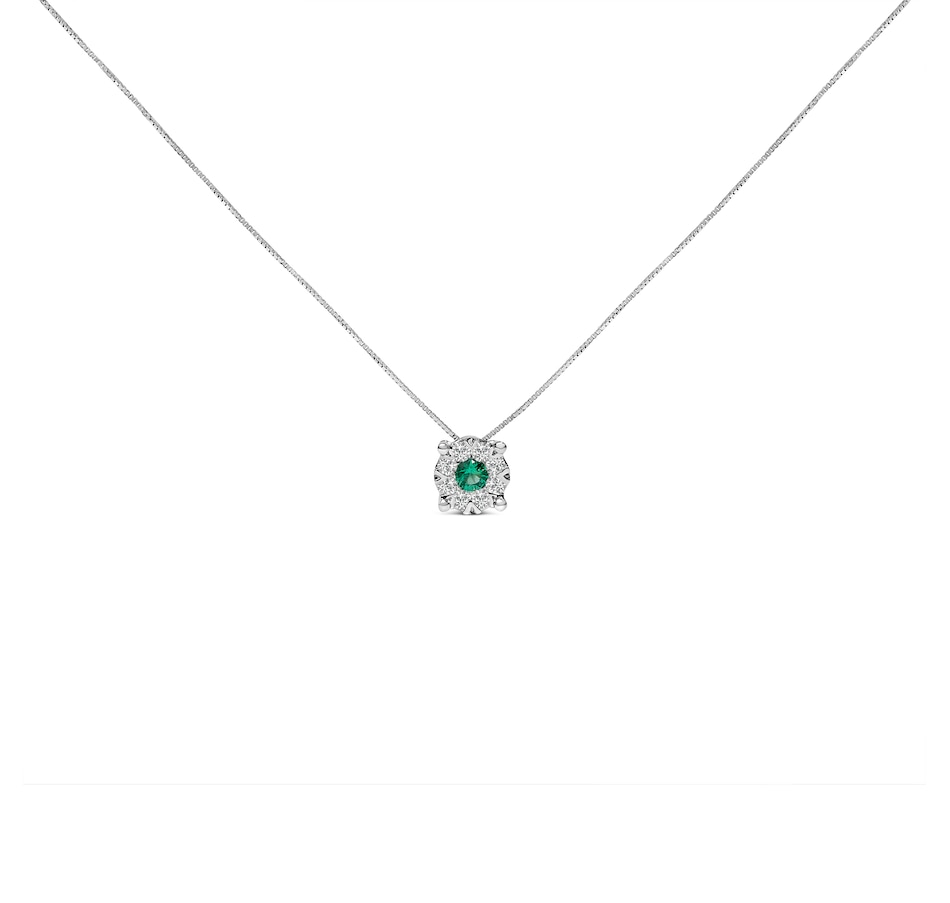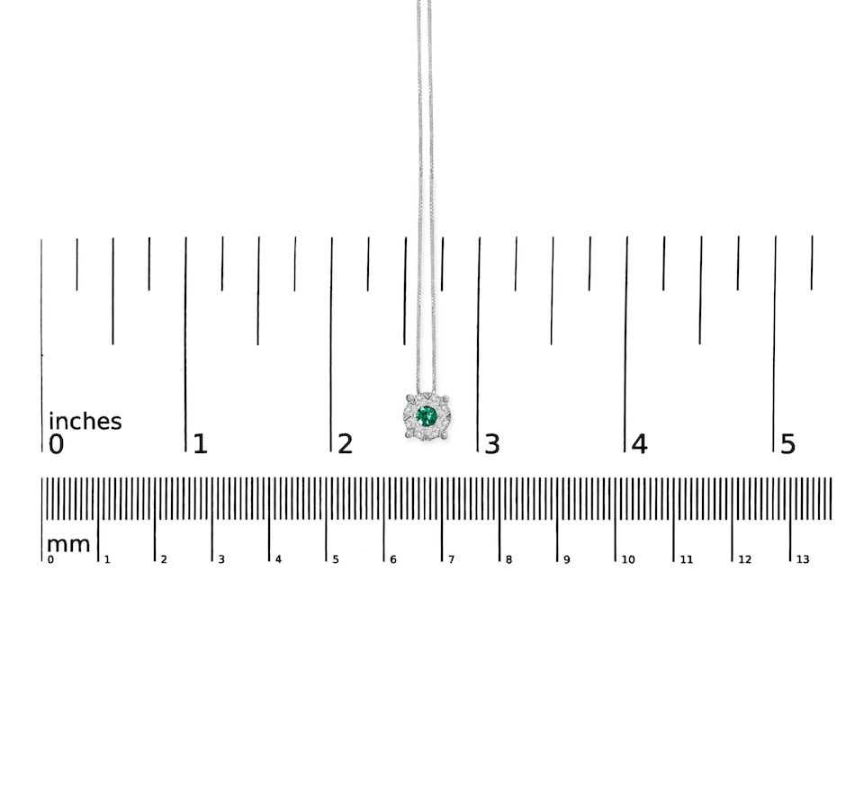 Draped in the elegance of 14K white gold, this pendant necklace is a masterpiece designed to captivate and charm. At its heart lies a naturally sourced, untreated 3.8 mm green emerald, its vibrant hue a symbol of renewal and love. Encircling this precious gem, a halo of meticulously selected diamonds, weighing a total of 1/3 carat, sparkles with unparalleled clarity (VS2-SI1) and a color grade of F-G, reflecting the heights of purity and brilliance. The piece is further enhanced by a rhodium-plated finish, ensuring its luster endures as brilliantly as the stars. Suspended from an 18-inch box chain that promises security with a spring ring clasp, this pendant is not merely jewelry; its an heirloom in the making, perfect for those seeking a touch of timeless sophistication. Emeralds are the birthstone for May.