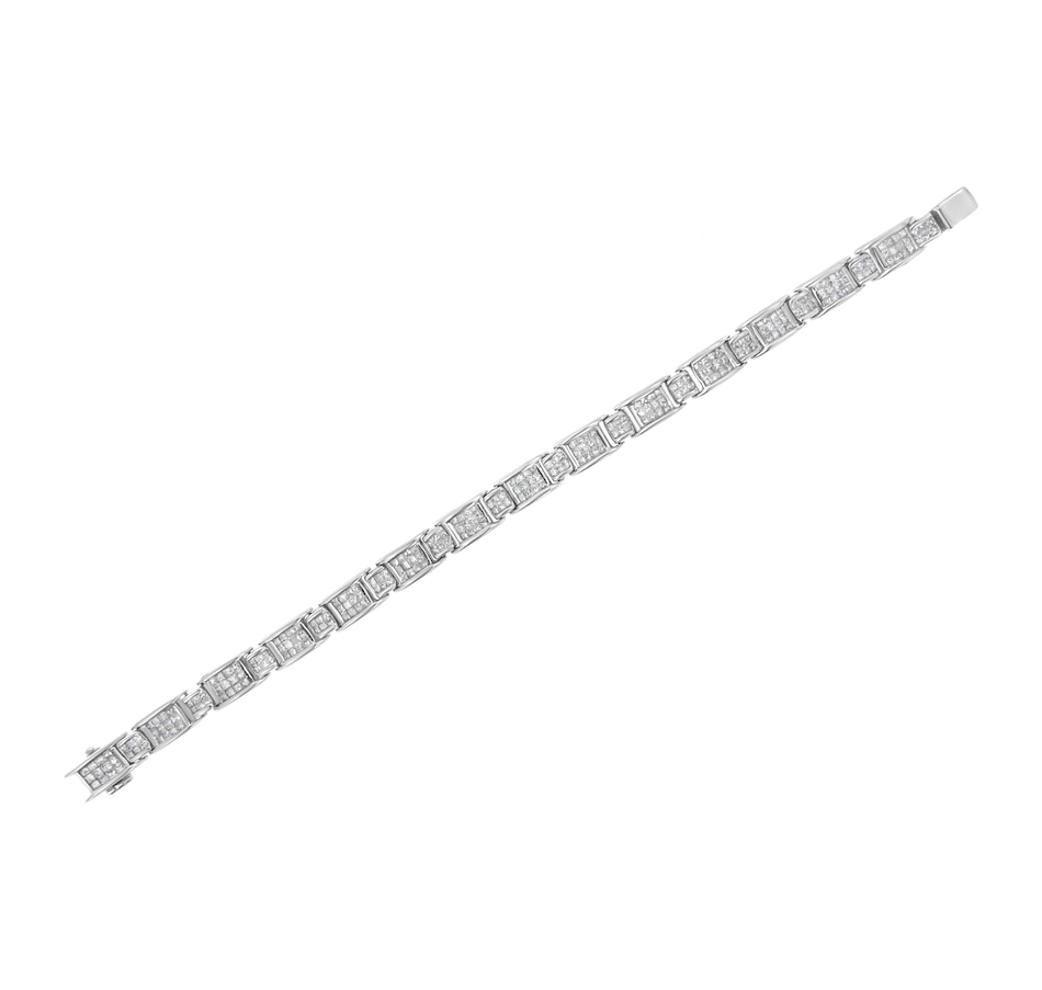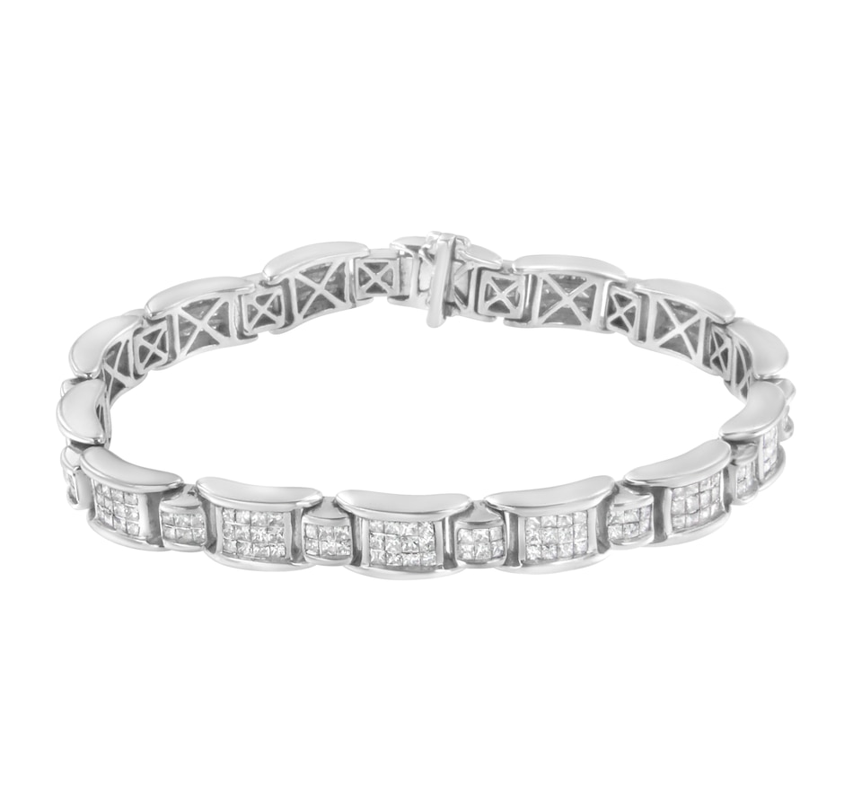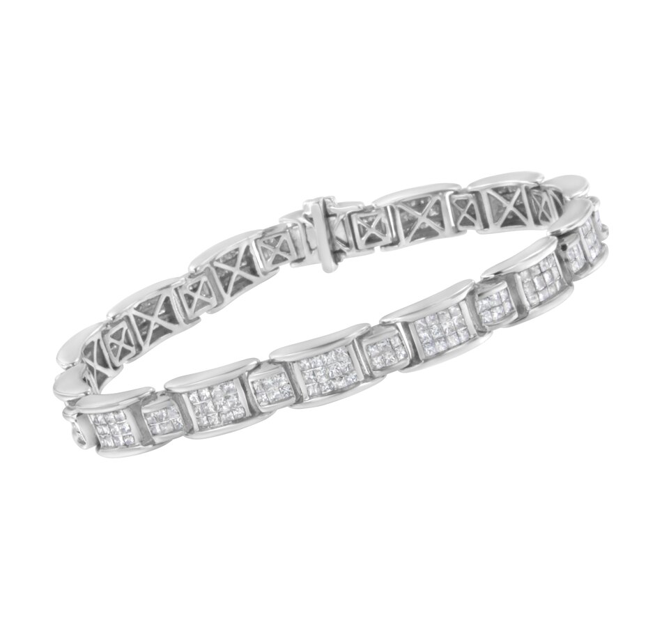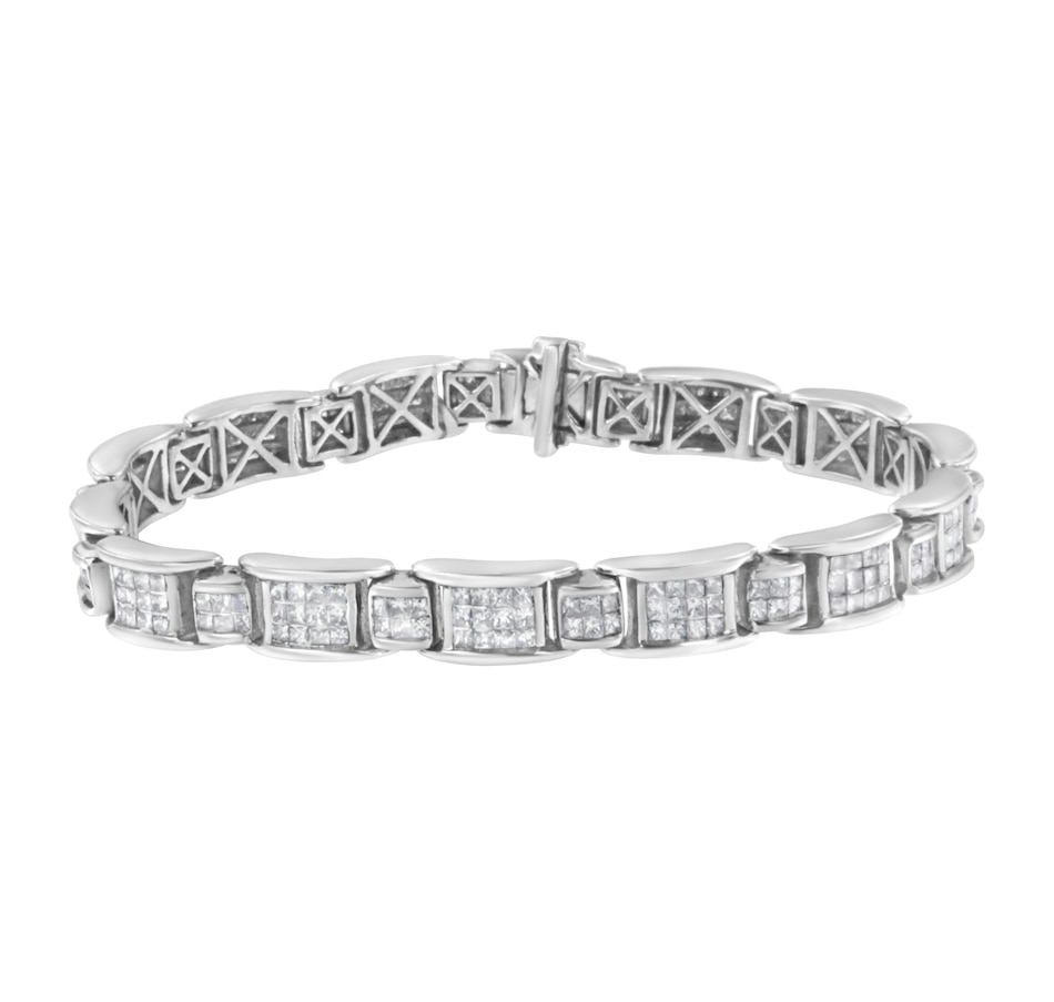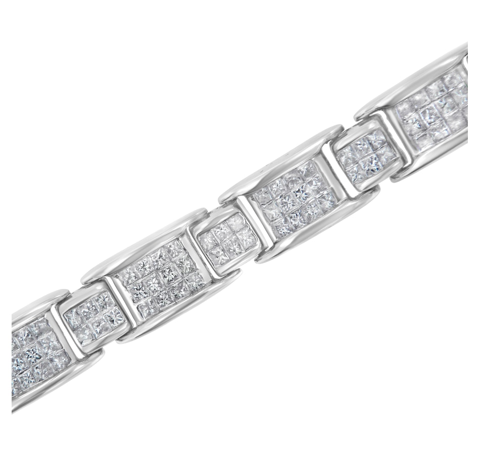 Elegant and timeless, this gorgeous 14K white gold alternating station tennis bracelet features 5.0 carat total weight of invisible set, princess cut diamonds with a whopping 252 stones in all. The tennis bracelet features alternating small and large hinged rectangular links inset with rows of square diamonds. The 7” bracelet fastens with a box with tongue clasp. This authentic design is crafted of real 14 karat gold, a precious metal that will keep a tarnish-free shine for years to come. This classic tennis bracelet makes a great gift for any special occasion! Whether worn for daytime glamour or evening sparkle, this bracelet is gorgeously versatile. Give her a gift that will perfectly complement her favorite ensemble.