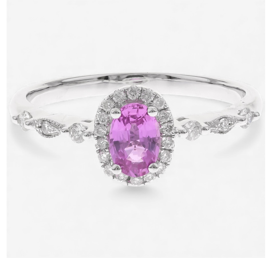 Add a touch of refined elegance to your jewellery collection with this exquisite pink sapphire and diamond halo ring, perfect for adding colour and brilliance to any look. The vibrant oval pink sapphire is beautifully framed by a sparkling halo of diamonds, all set in polished 14K white gold.