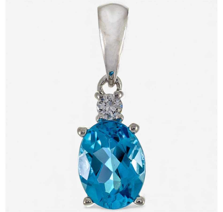 Elevate your elegance with this 14K white gold Swiss blue topaz and diamond pendant with chain. This stunning piece features a vibrant 8mm x 6mm oval, prong-set, faceted Swiss blue topaz weighing approximately 1.27 carats, radiating a brilliant ocean hue. Accented by a sparkling round diamond (0.04 ctw), the design exudes sophistication and timeless beauty. Suspended from a sleek cable chain secured with a durable lobster claw clasp, this pendant combines luxury and practicality for everyday wear or special occasions. Perfect for those who appreciate refined style, it’s a statement of grace and brilliance. Own the elegance.