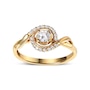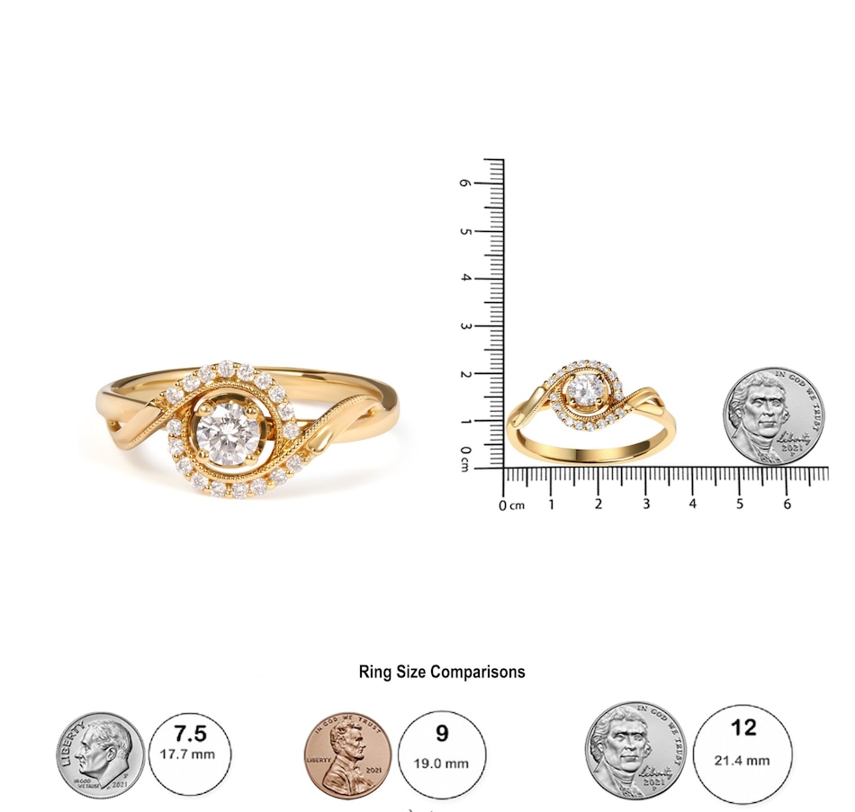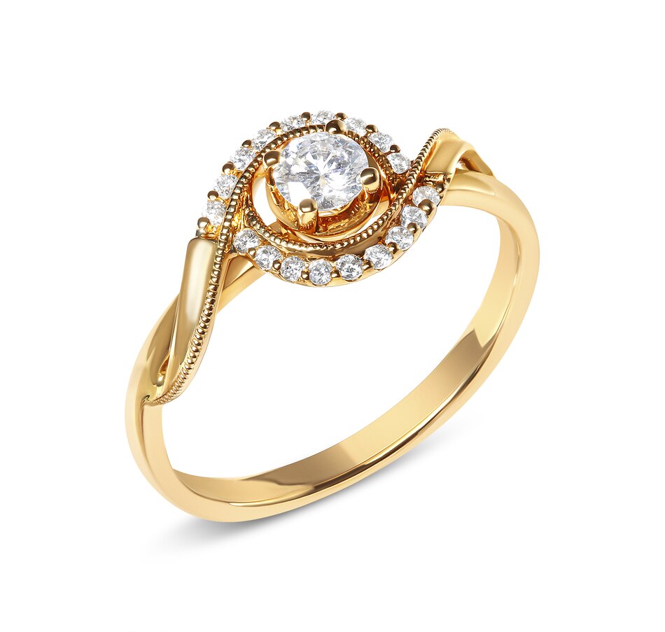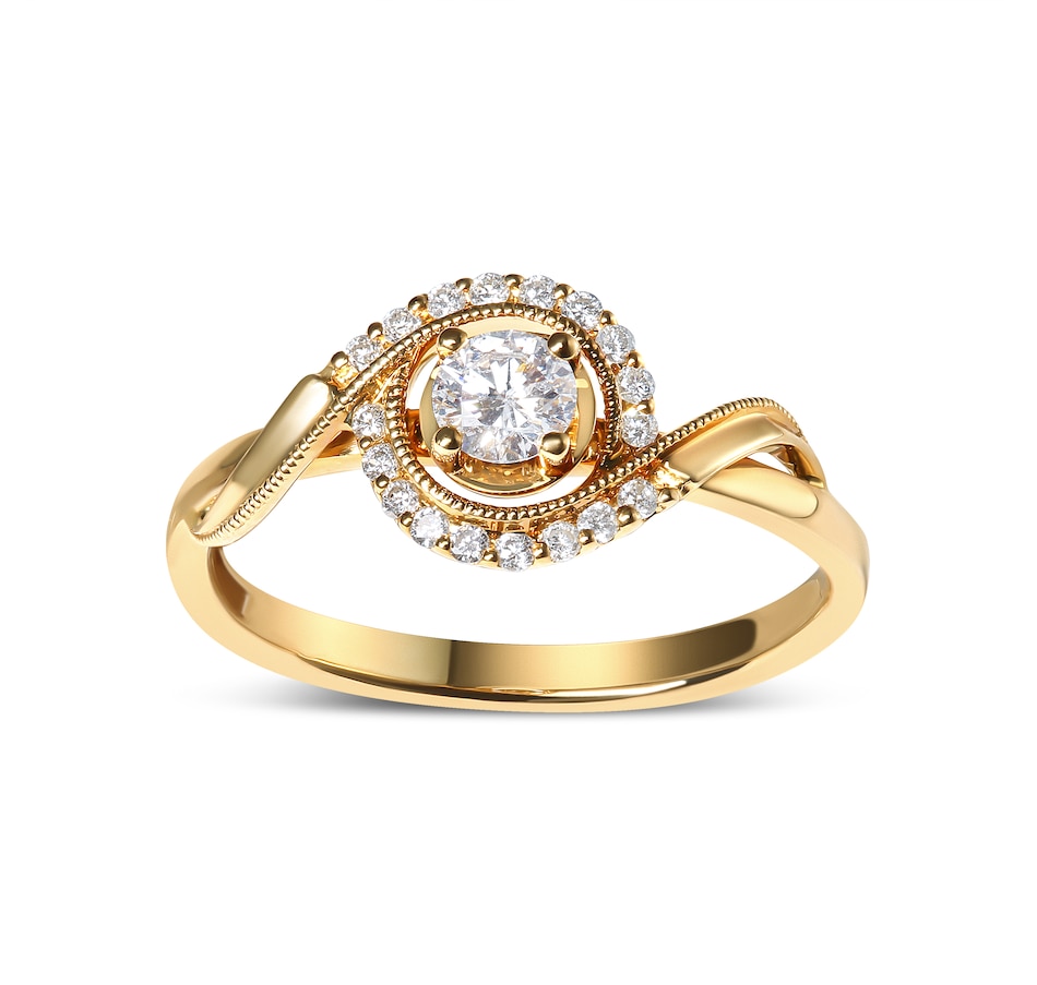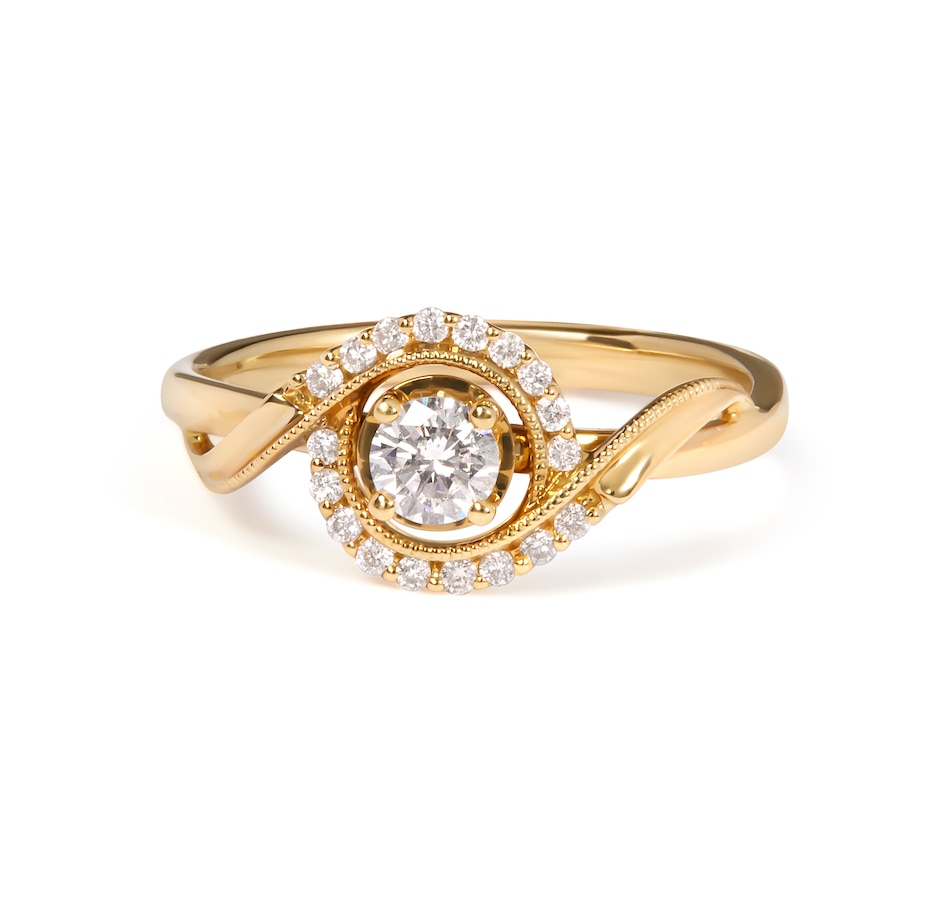 Embodying the essence of romance and eternal love, this exquisite 14K yellow gold engagement ring sparkles with a breathtaking 1/4 cttw round diamond cradled at its heart in a secure 4-prong setting, radiating a light that captures the depths of devotion. Around this central marvel, a halo of shimmering diamonds, each meticulously set in shared prongs, magnifies the radiance, while the delicate beaded milgrain detailing along the inner border whispers of antique elegance. The band itself twists elegantly, mirroring the intertwining fates of destined souls. Natural, earth-mined diamonds offer a pure and brilliant testament to a love that is as authentic as it is profound. This ring, a perfect symbol of unity and allure, is destined to become a beloved heirloom.
