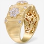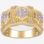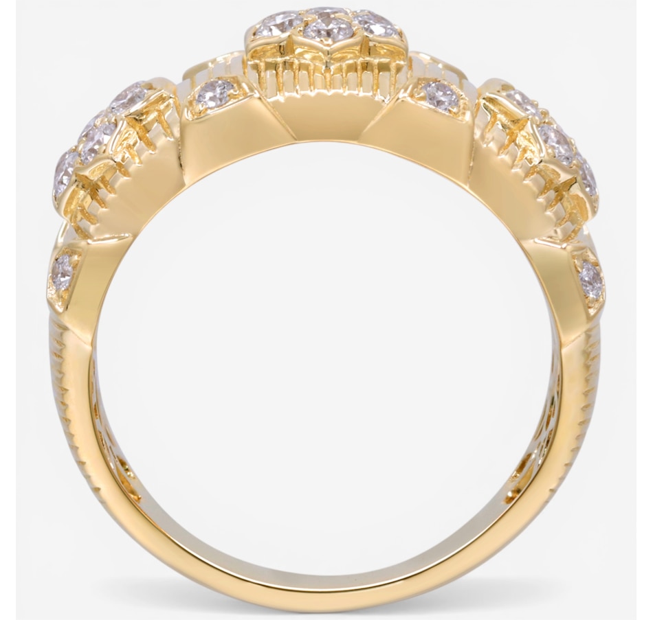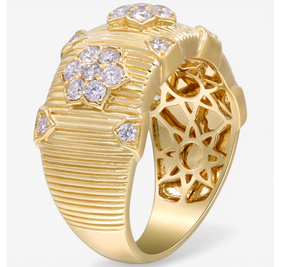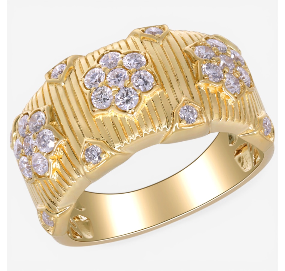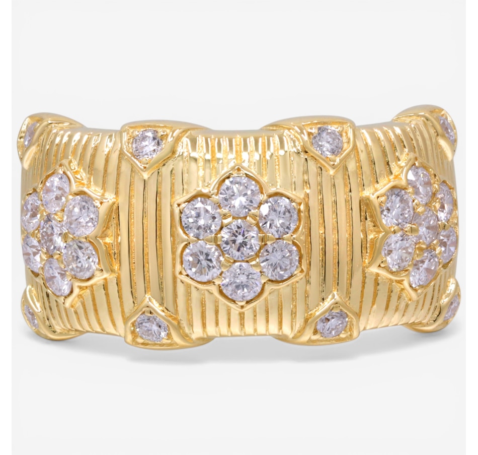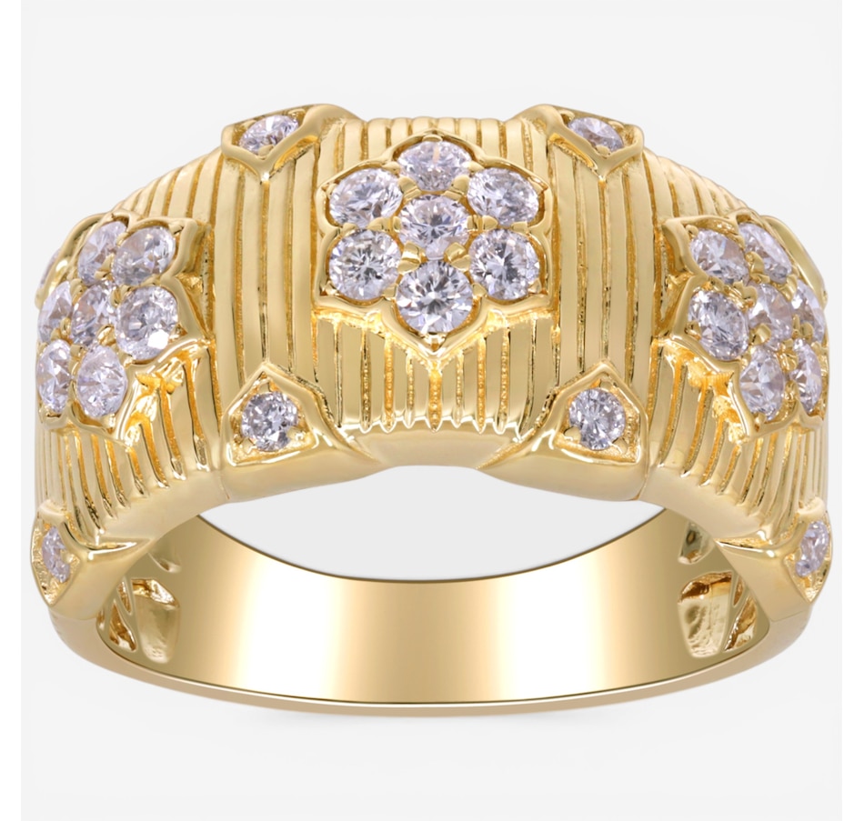 This radiant diamond band sparkles with refined brilliance, its faceted stones glowing beautifully against the warm sheen of yellow gold. The polished design creates a bold yet elegant presence on the hand, catching the light with every movement. Luxurious and timeless, it’s a striking piece that adds sophisticated shine to any jewellery collection.
