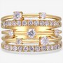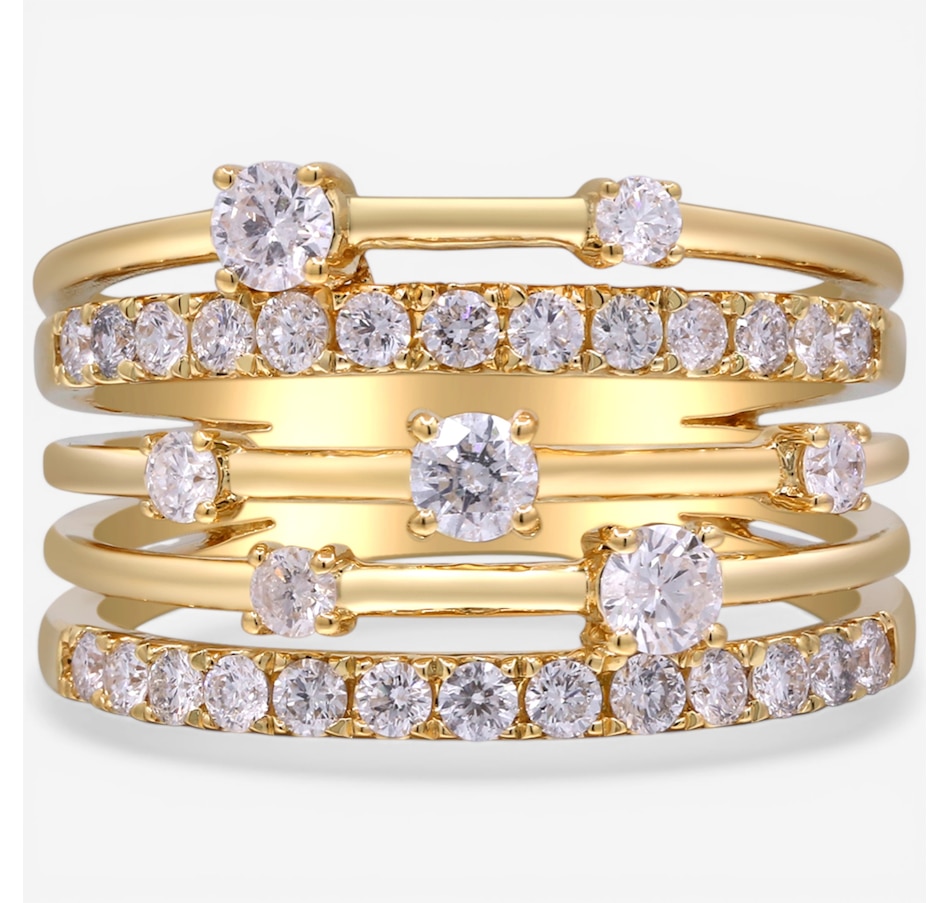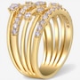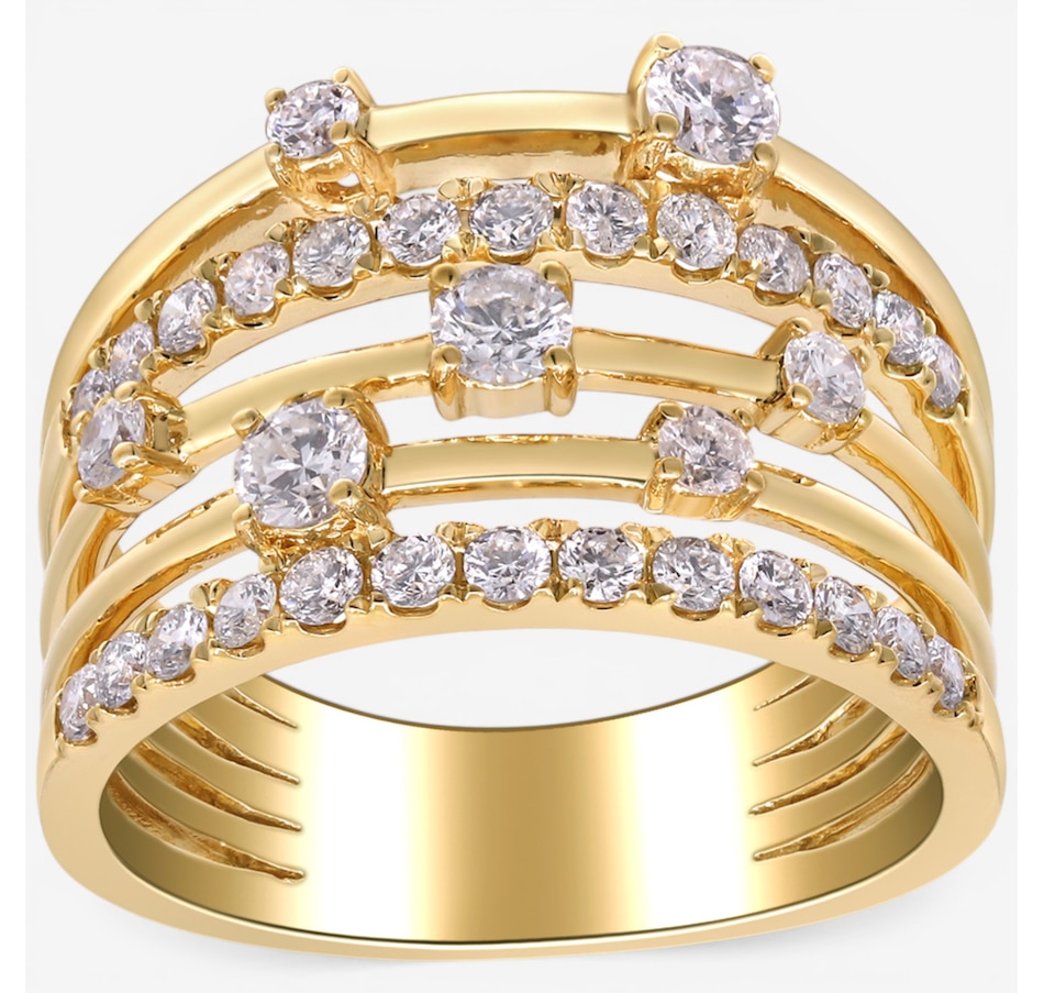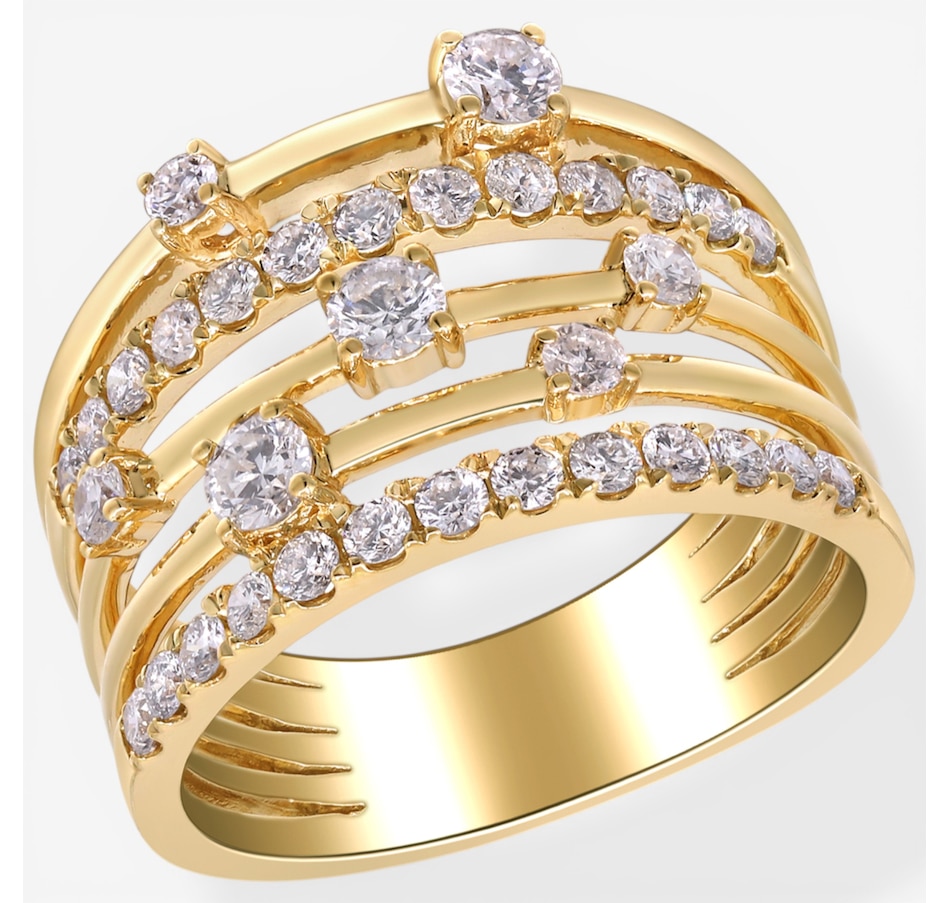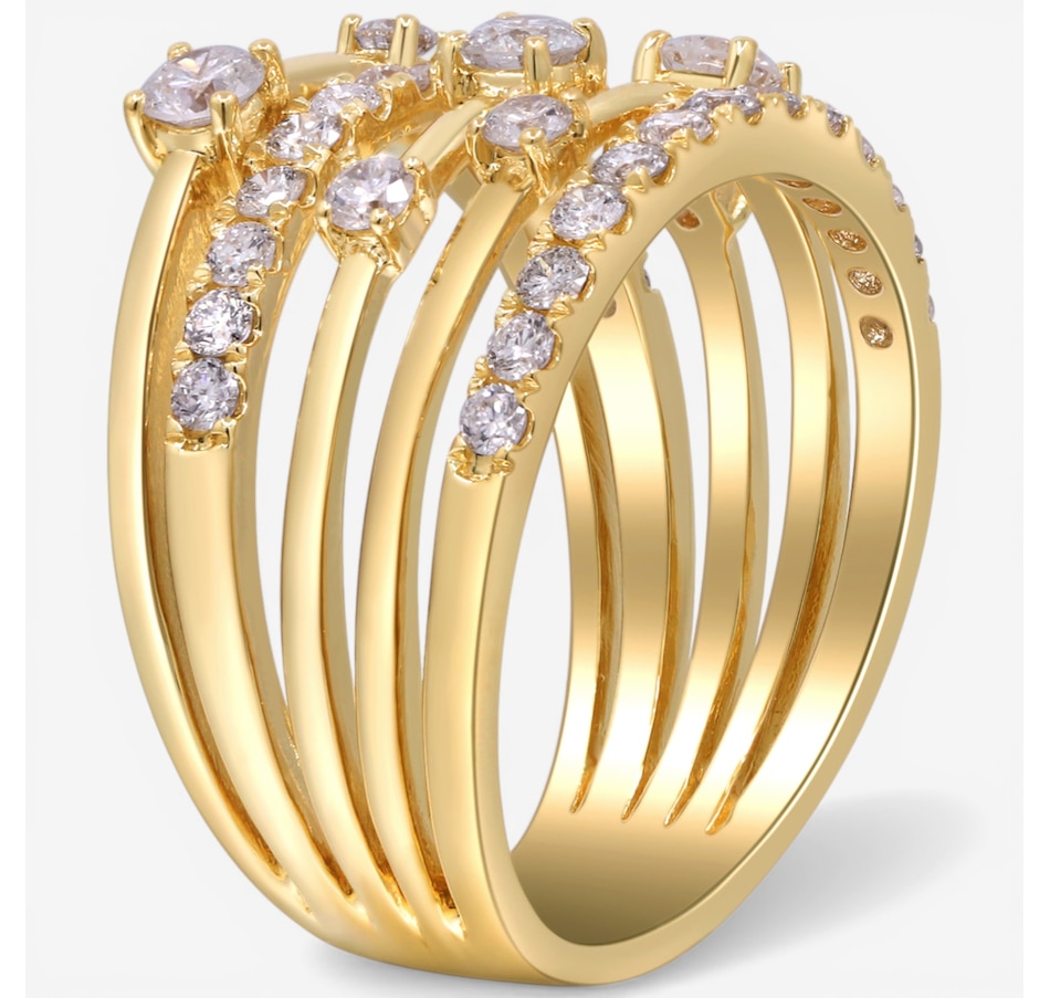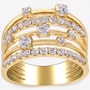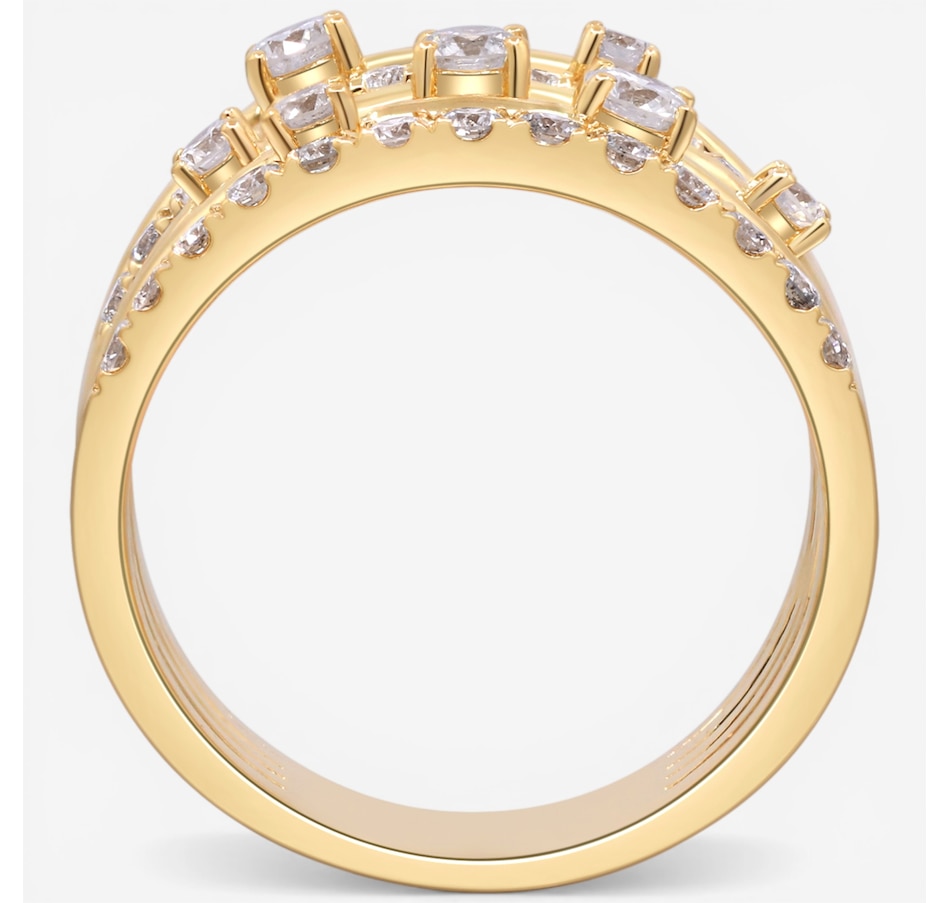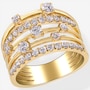This luminous multi‑row ring dazzles with a brilliant sweep of faceted diamonds arranged across its polished yellow gold bands. Each stone catches the light with graceful radiance, creating a look that feels both luxurious and timeless. Bold yet beautifully refined, it’s a striking piece that brings elegant sparkle to any jewellery collection.
