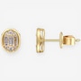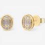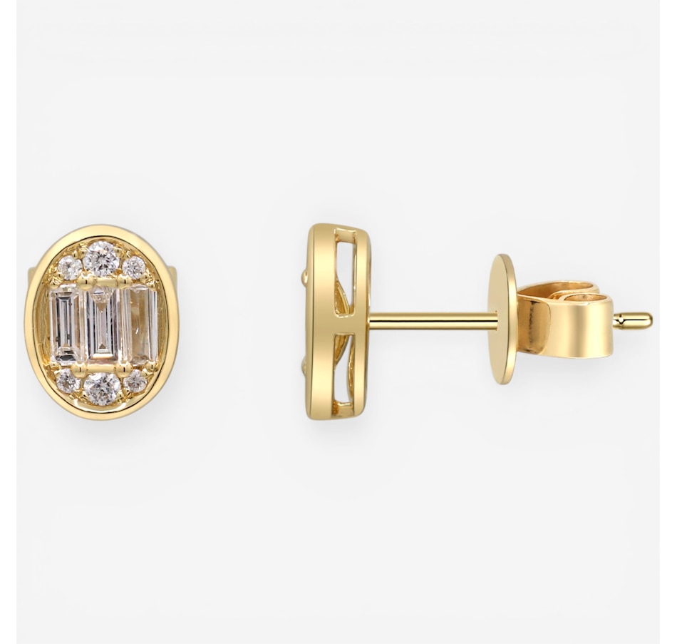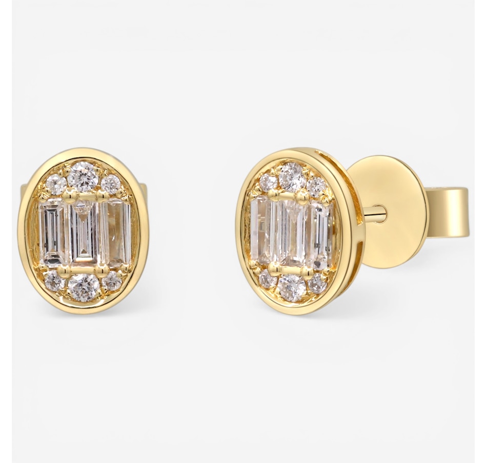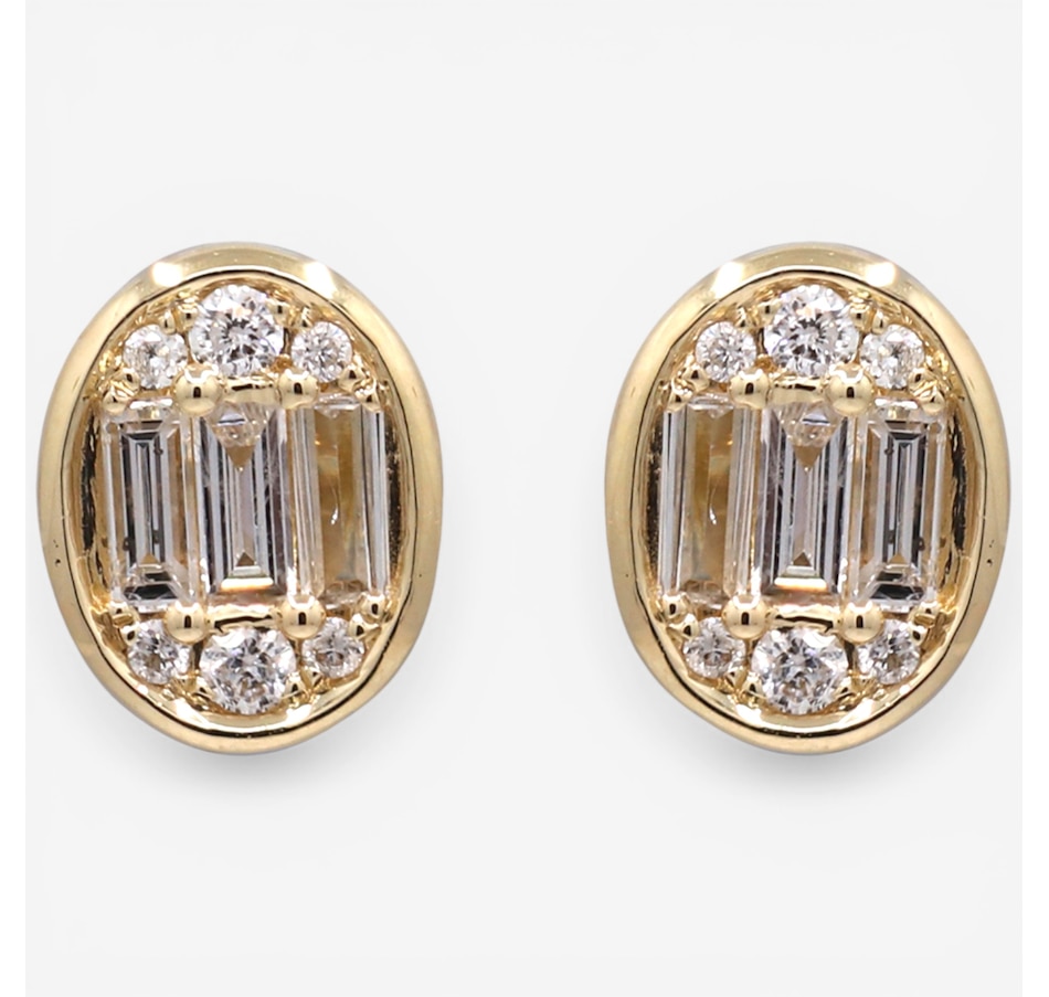 These elegant stud earrings sparkle with a beautiful mix of round and baguette diamonds arranged in a refined oval silhouette. The polished yellow gold setting enhances the stones’ soft radiance, creating a graceful look that catches the light from every angle. Delicate yet striking, they are a timeless pair that brings luminous sophistication to any jewellery collection.