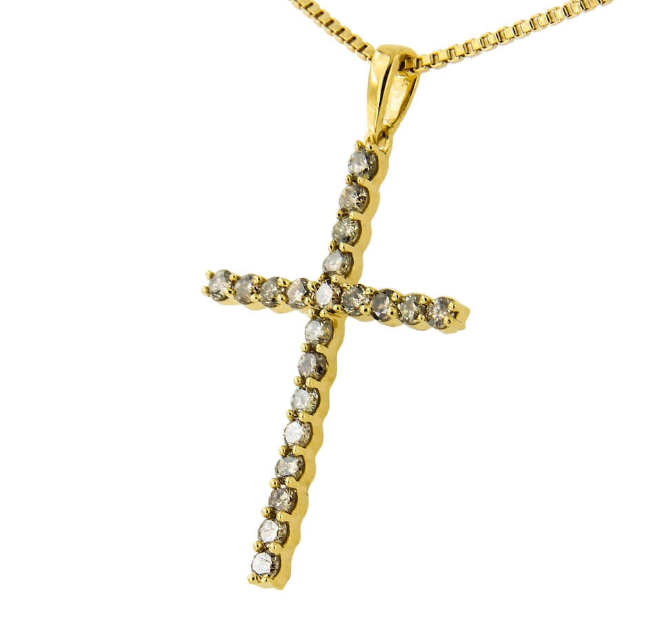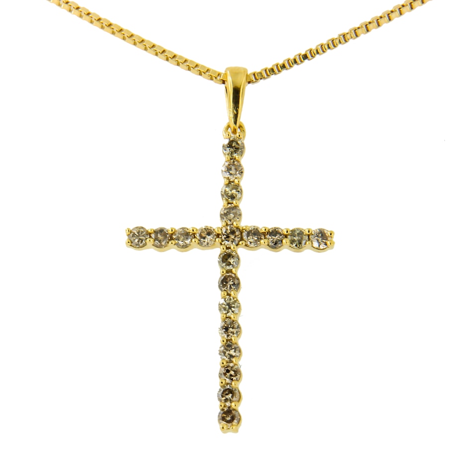 Embrace your spirituality with this sparkling 14kt yellow gold plated 925 sterling silver cross necklace. This pendant is embellished with 21 champagne color diamonds in classic shared prong settings. The diamonds are round-cut and have a total carat weight of 1/2 c.t. This piece comes with an 18" inch rope chain that hangs beautifully off the neck. This cross pendant is the perfect piece to celebrate your faith everyday.