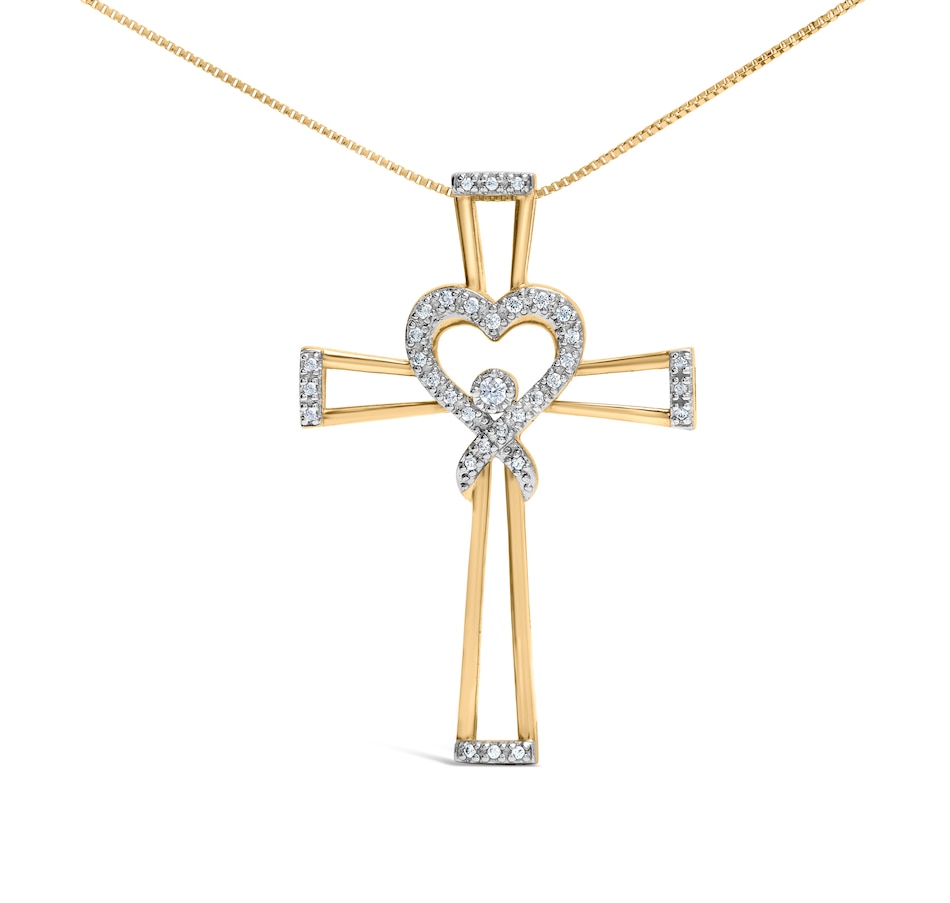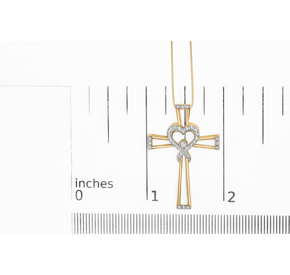 Envelop your neckline with a tapestry of devotion and elegance with our exquisite necklace, where artistry and faith intertwine. Fashioned in .925 sterling silver and embraced by a luxurious 14K yellow gold plating, this pendant exquisitely melds an interlocking heart and ribbon motif with a graceful cross design, evoking a timeless symbol of love and spirituality. Each detail is meticulously crafted, adorned with a scintillation of natural diamonds, collectively weighing 1/6 carat. The gems, resplendent with an H-I color and I2-I3 clarity, dance light with every movement. Suspended on an 18-inch box chain that lies smoothly against the skin, secured with a dependable spring ring clasp, this piece is not just an ornament, but a statement of passion and refined taste, poised to become a cherished heirloom.
