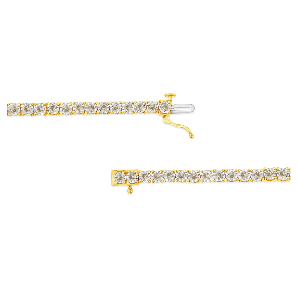 This tennis bracelet is a classic and will look glamorous on your wrist! This gorgeous piece is embellished in the finest 14k yellow gold plated .925 sterling silver. Boasting an impressive a total diamond weight of 3 cttw, this piece is set with round-cut diamonds in a unique miracle setting. The diamonds are L-M in color and have a I2-I3 clarity. This bracelet is perfect for any formal occasion, and will impress all those who set eyes upon it.