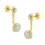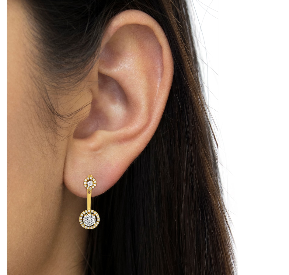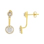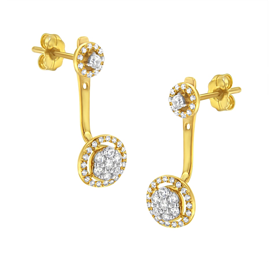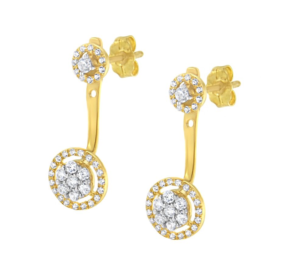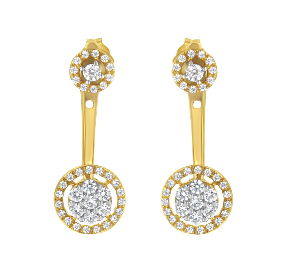 Delight in the timeless elegance of our 14K yellow gold-plated sterling silver earrings. Embellished with a stunning array of round-cut diamonds totaling 5/8 carat, these earrings radiate a captivating sparkle. Versatility is at the heart of this design, featuring detachable studs. Each stud showcases a central round-cut diamond, encased by a halo of accent diamonds. The flower-inspired design of the studs, with a diamond cluster nestled within a floating halo of accents, adds an extra layer of allure. With a graceful drop of 4/5 inch, these pieces add a dash of sophistication to any look. They can be worn with or without the jackets, suiting both casual and formal styles. As a testament to fine craftsmanship and elegance, these earrings are a worthy addition to any collection. For a subtler effect, the top stud can be worn solo.