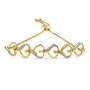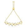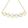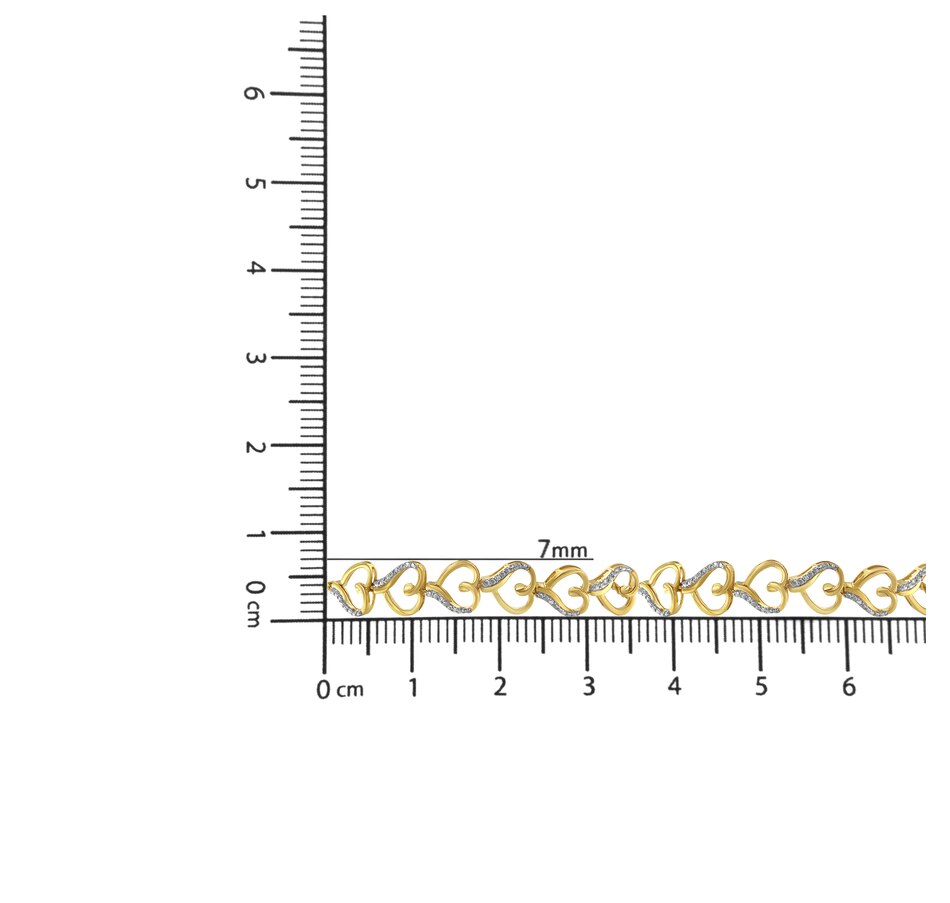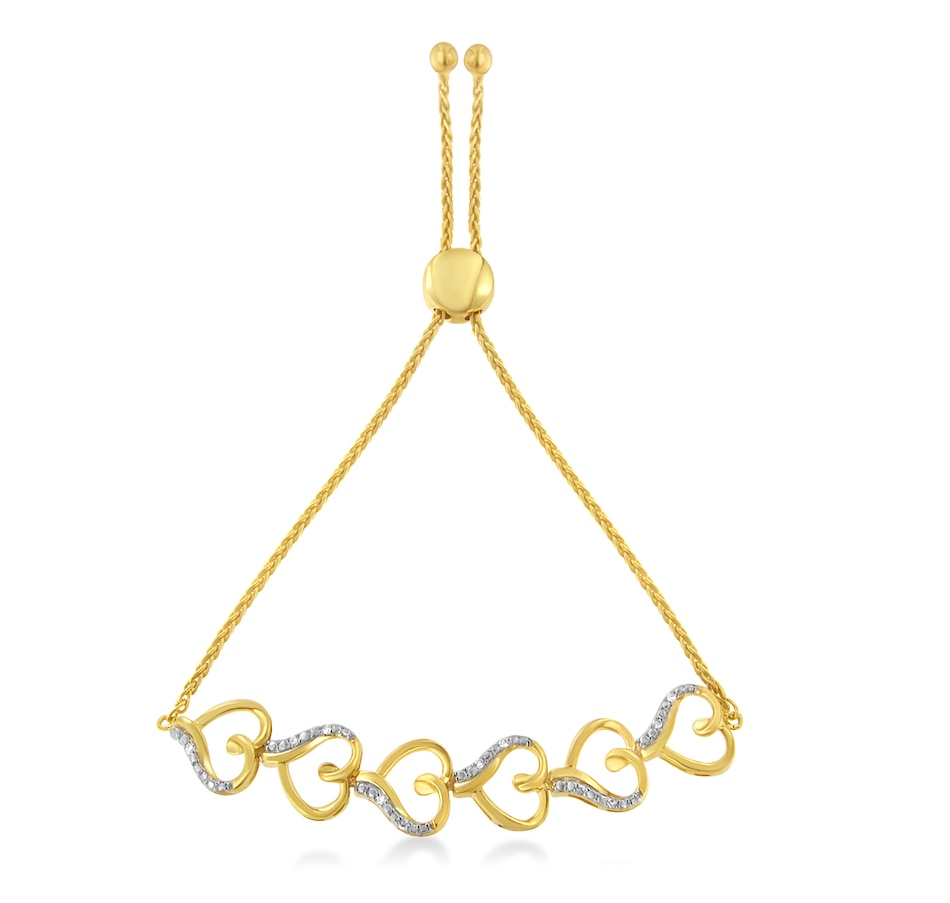 Love is all over this exquisite bracelet. Six heart shapes connect to one another in this 14k yellow gold plated sterling silver bolo bracelet. Each heart is created by a single yellow gold ribbon that twists and flows to create the shape. One side of the heart is accented by silver beading accented with two glimmering round cut diamonds. 1/10ct TDW of diamonds are displayed in this adjustable bolo bracelet design.