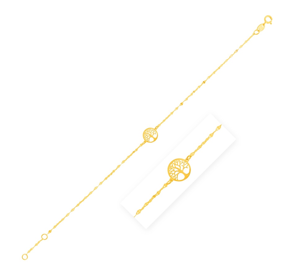 A heartfelt Tree of Life symbol punctuates fine mirrored chain to create this simply gorgeous 14K yellow gold bracelet. Bracelet is 7 inches long, 1.2mm wide, and closes with a spring ring clasp. Tree of Life symbol measures 12.5x7.9mm.