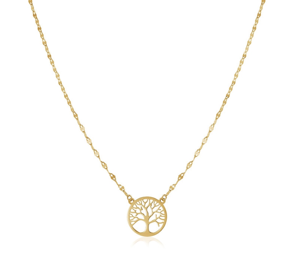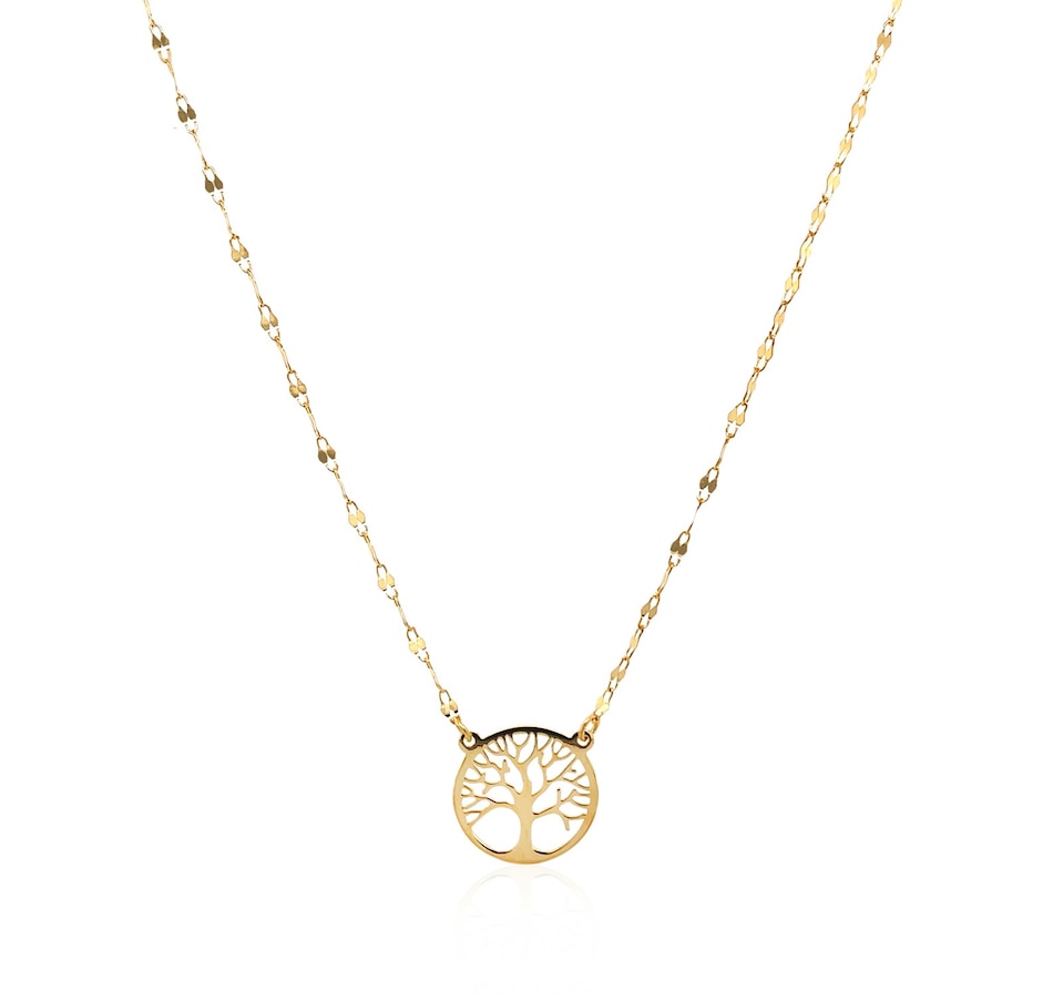 This lovely, sparkling chain necklace suspends a beautiful Tree of Life symbol, all formed in beautifully polished 14K yellow gold. Necklace is 18 inches long and 1.2mm wide, and Tree of Life symbol measures 19.9x10.3mm.