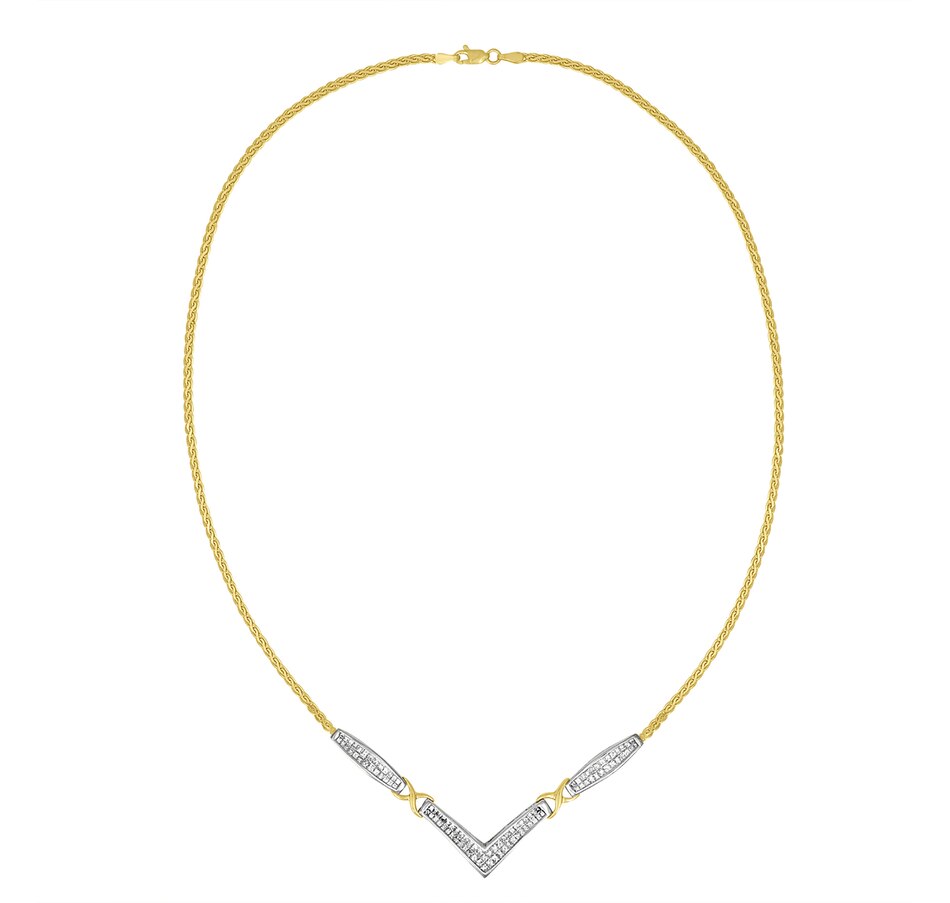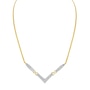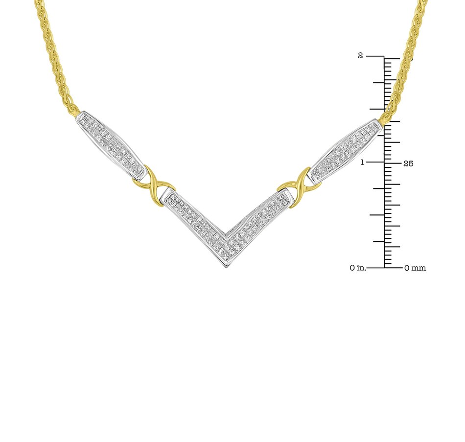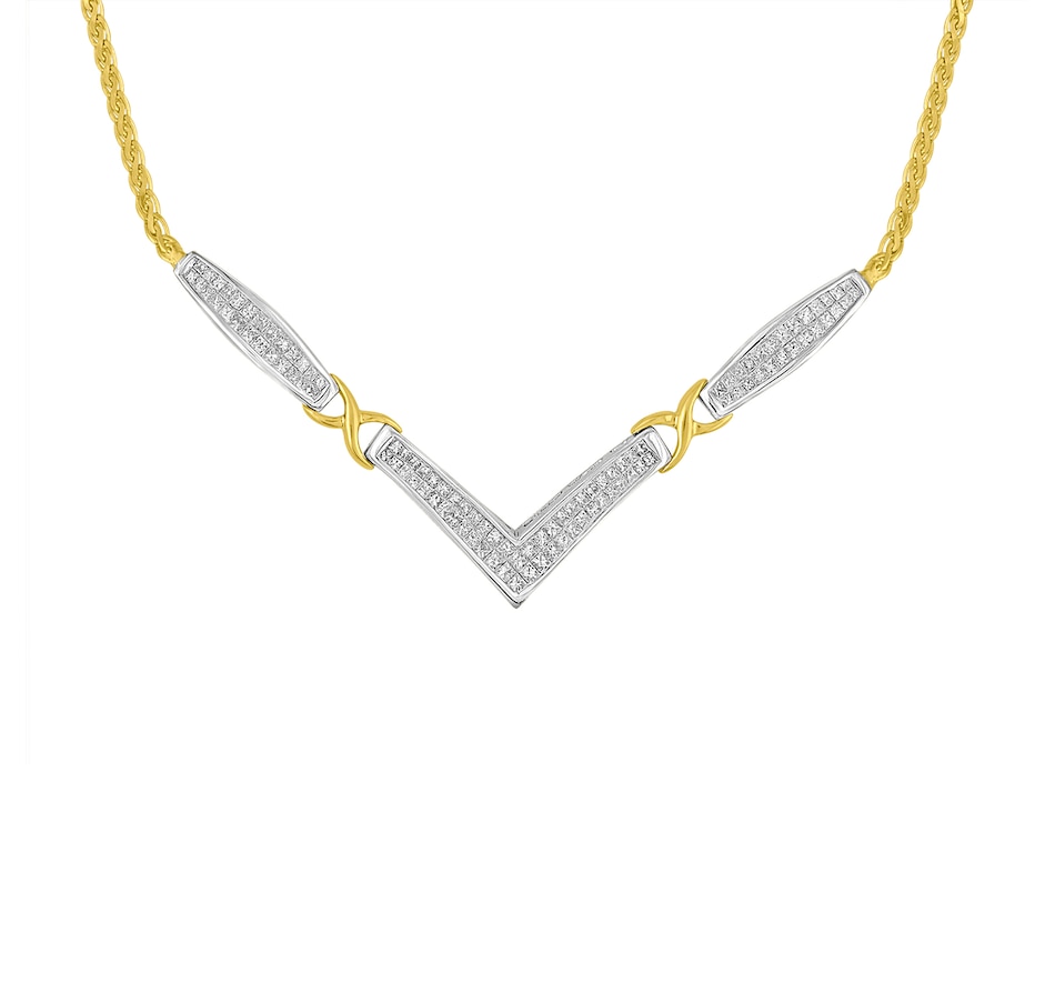 This stunning 14K yellow and white gold pendant necklace features flared rectangle shapes followed by X-shaped links sandwiching a flared V shaped centerpiece. Both the rectangles and the V shaped segments are inset with two rows of invisible set princess cut diamonds set in 14K white gold while the X shaped links are made of 14K yellow gold. The necklace has a wide franco chain with a lobster claw clasp. The contemporary yet classic 18" necklace complements any neckline beautifully. This authentic design is crafted of real 14 karat gold, a precious metal that will keep a tarnish-free shine for years to come. This sweet necklace makes a great gift for any special occasion! Whether worn for daytime glamour or evening sparkle, this necklace is gorgeously versatile. Coordinate it with your favorite diamond earrings or other diamond jewelry to create a complete and elegant ensemble. It's a classic and feminine piece she'll want to show off every day.