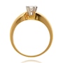 This gold diamond ring features three marquise shaped diamond, set on an angle, within 6 white gold prongs. The yellow gold band is high polished with a rounded top that curves up, at the top, and down, at the bottom, in a bypass fashion.